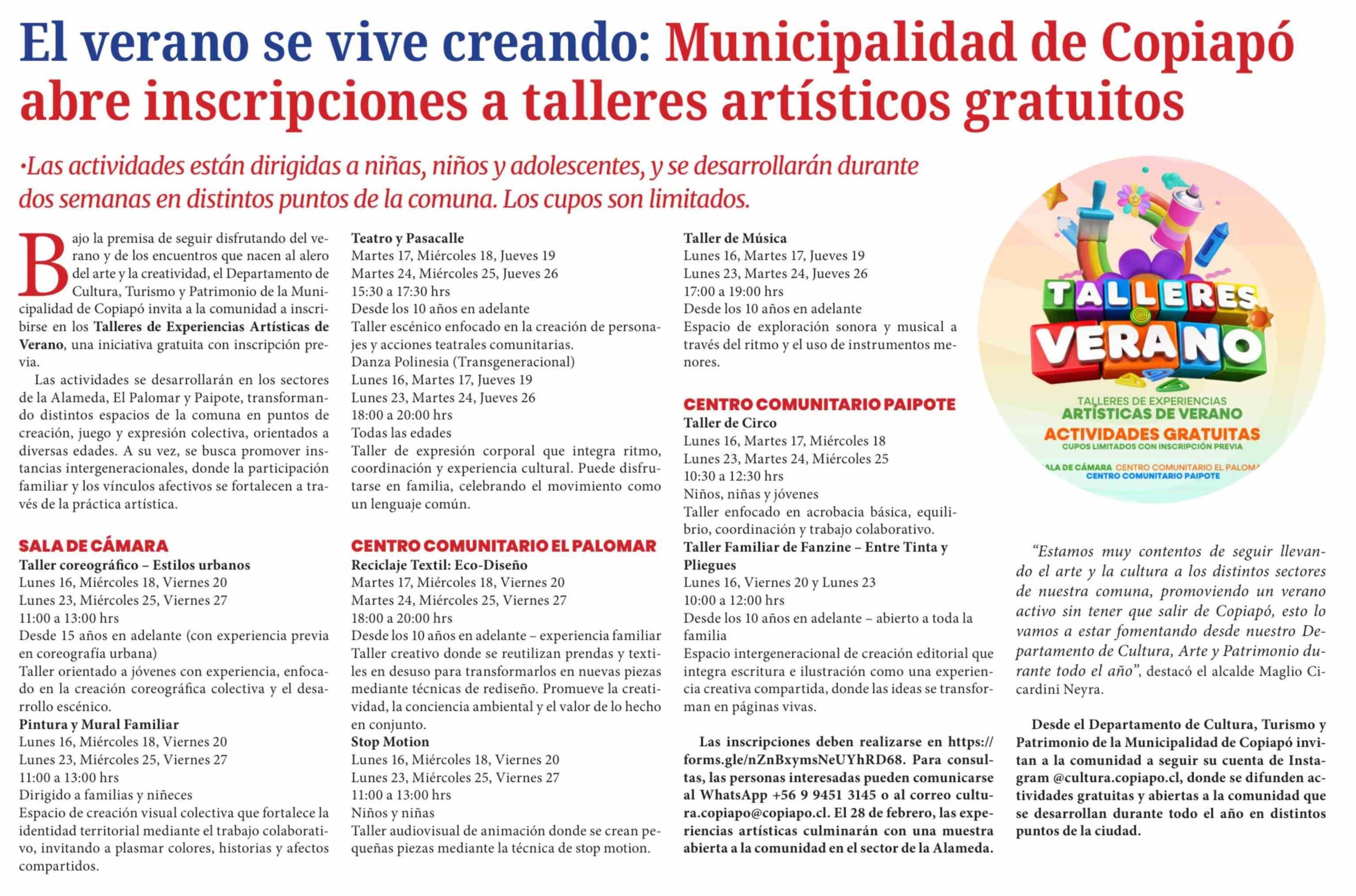 | Título: | El verano se vive creando: Municipalidad de Copiapó abre inscripciones a talleres artísticos gratuitos |