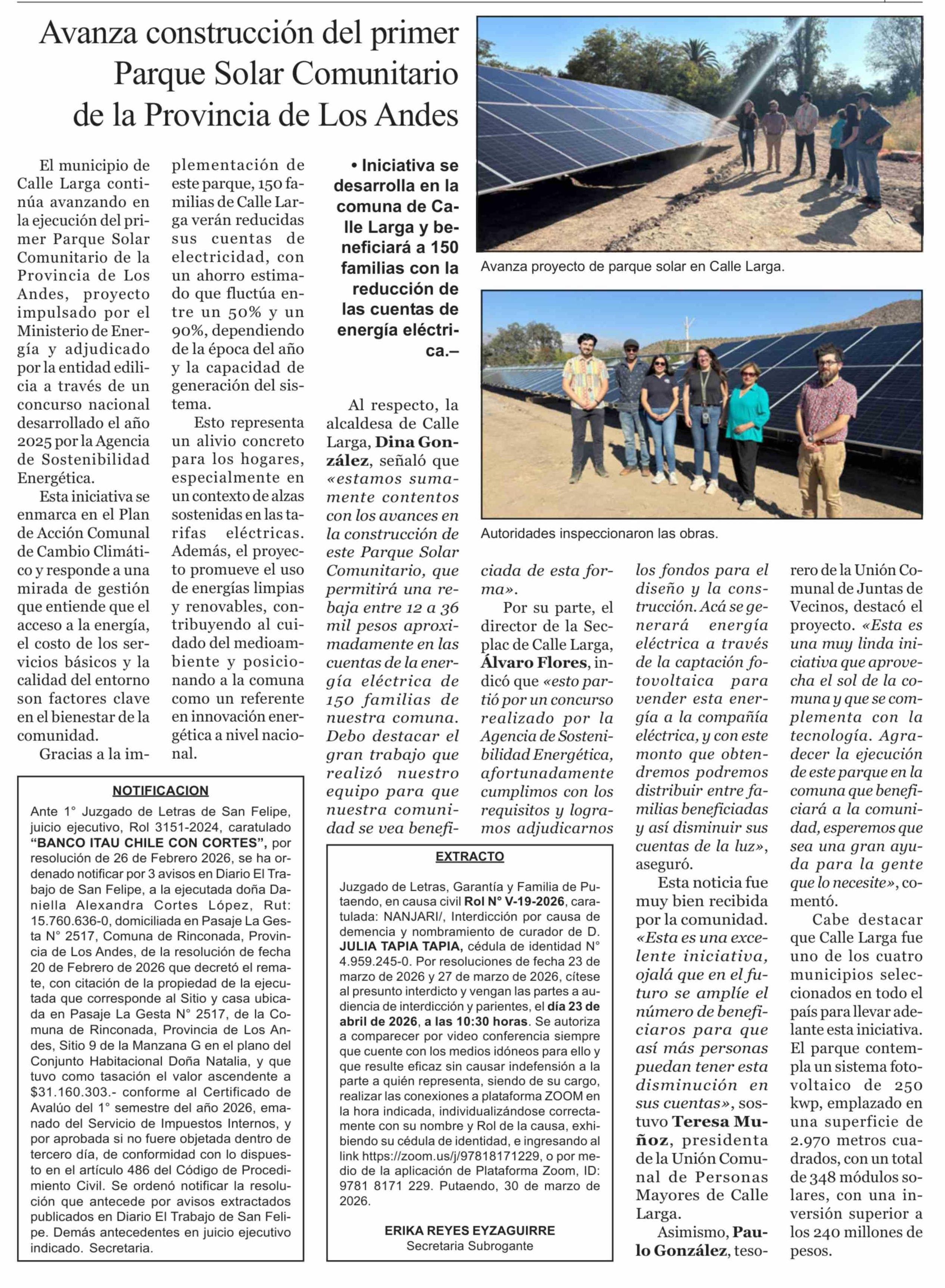 Avanza construcción del primer Parque Solar Comunitario de la Provincia de Los Andes 08-04-2026 El Trabajo |