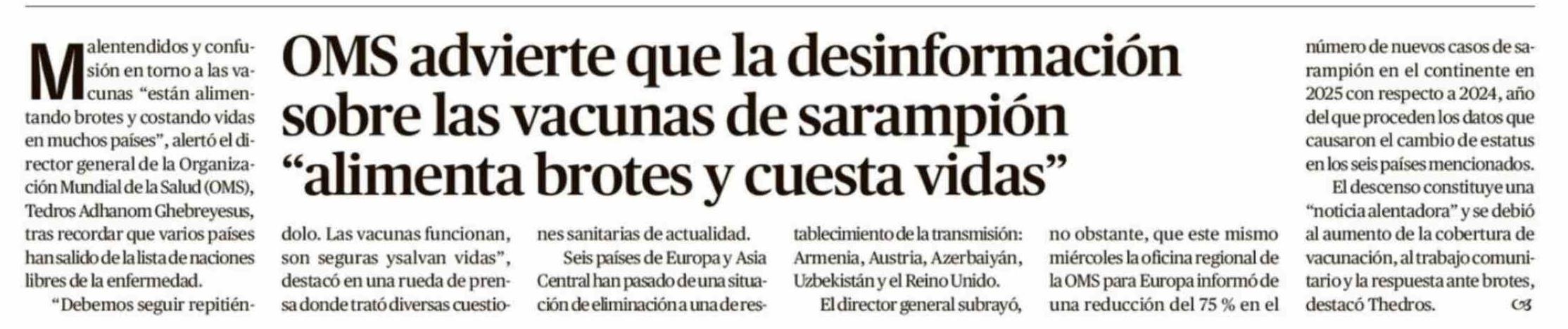 | Título: | OMS advierte que la desinformación sobre las vacunas de sarampión "alimenta brotes y cuesta vidas" |