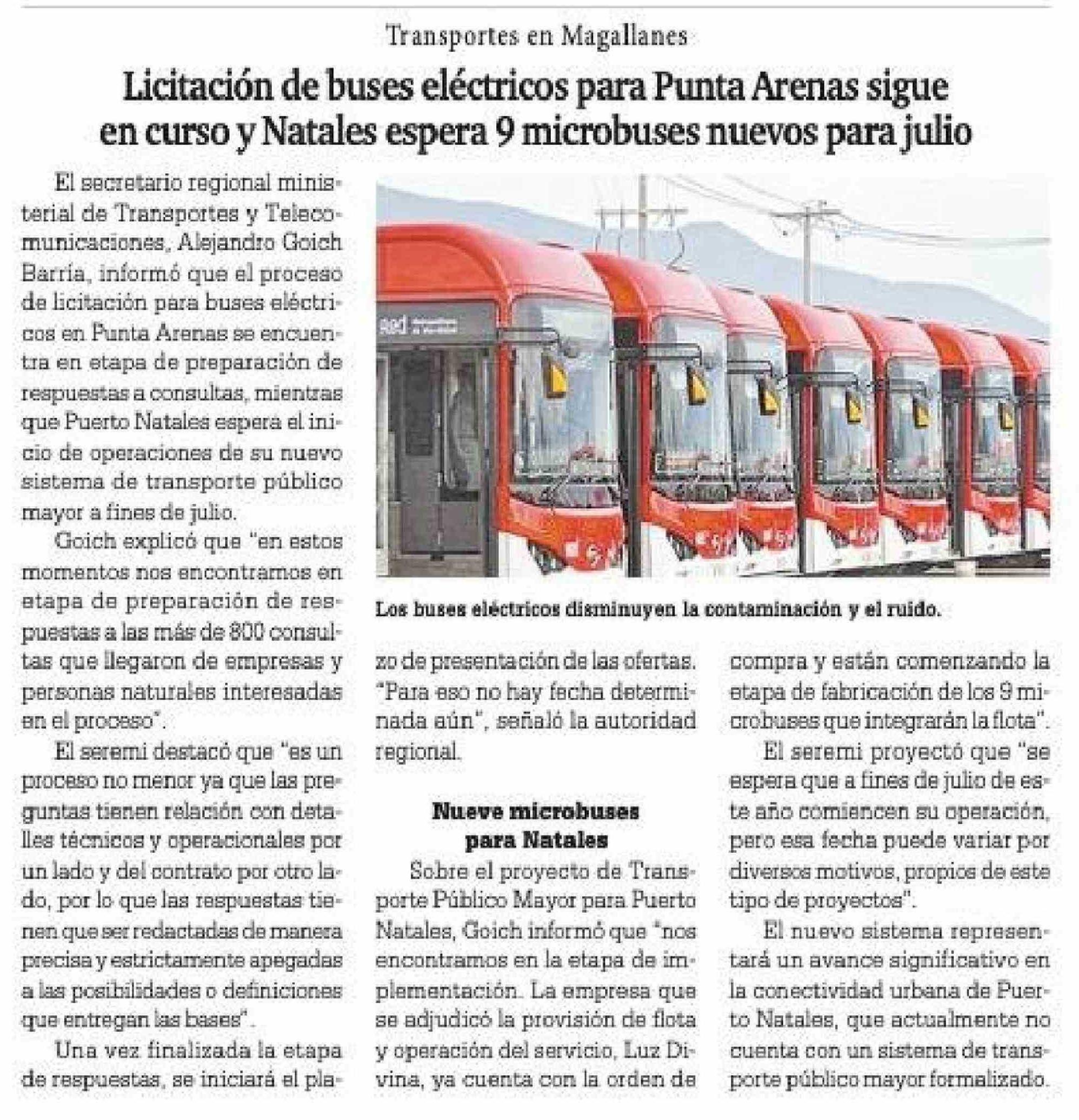 | Título: | Licitación de buses eléctricos para Punta Arenas sigue en curso y Natales espera 9 microbuses nuevos para julio |