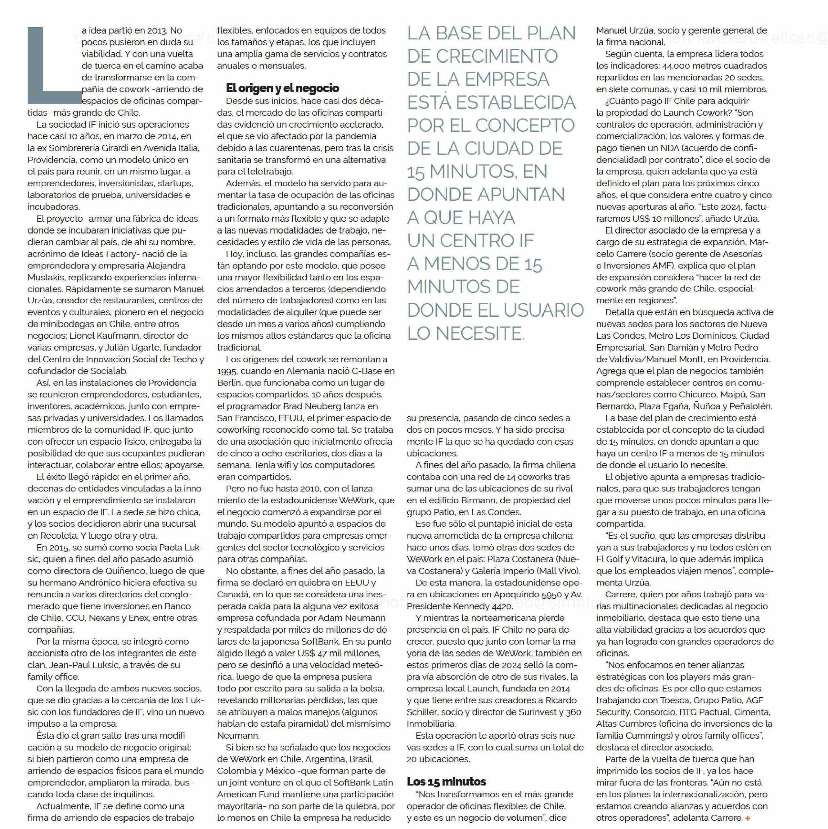 IF, EL COWORK DE LOS LUKSIC, MUSTAKIS Y COMPANIA SE QUEDA CON MAS SEDES DE WEWORK Y SE CONSOLIDA COMO EL MAS GRANDE DE CHILE 14-01-2024 Diario Financiero |