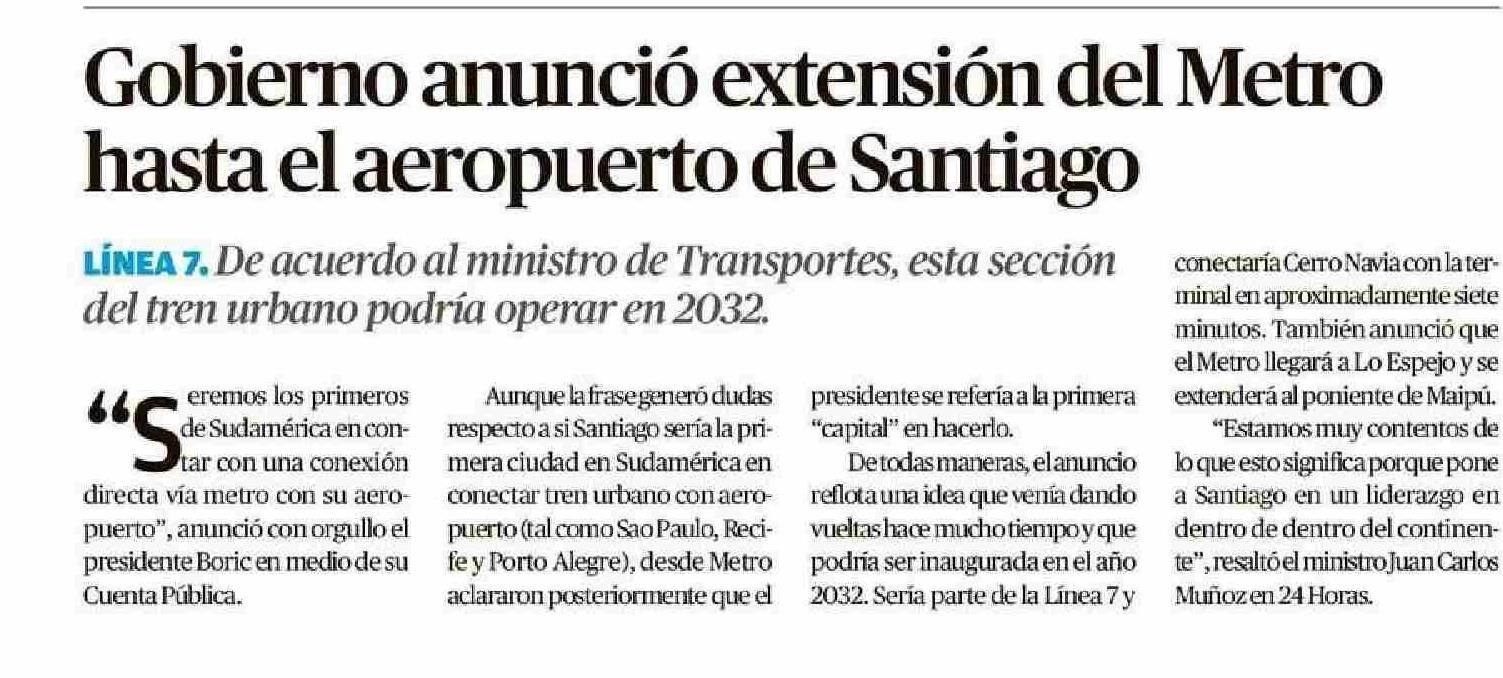 | Título: | Gobierno anunció extensión del Metro hasta el aeropuerto de Santiago |
