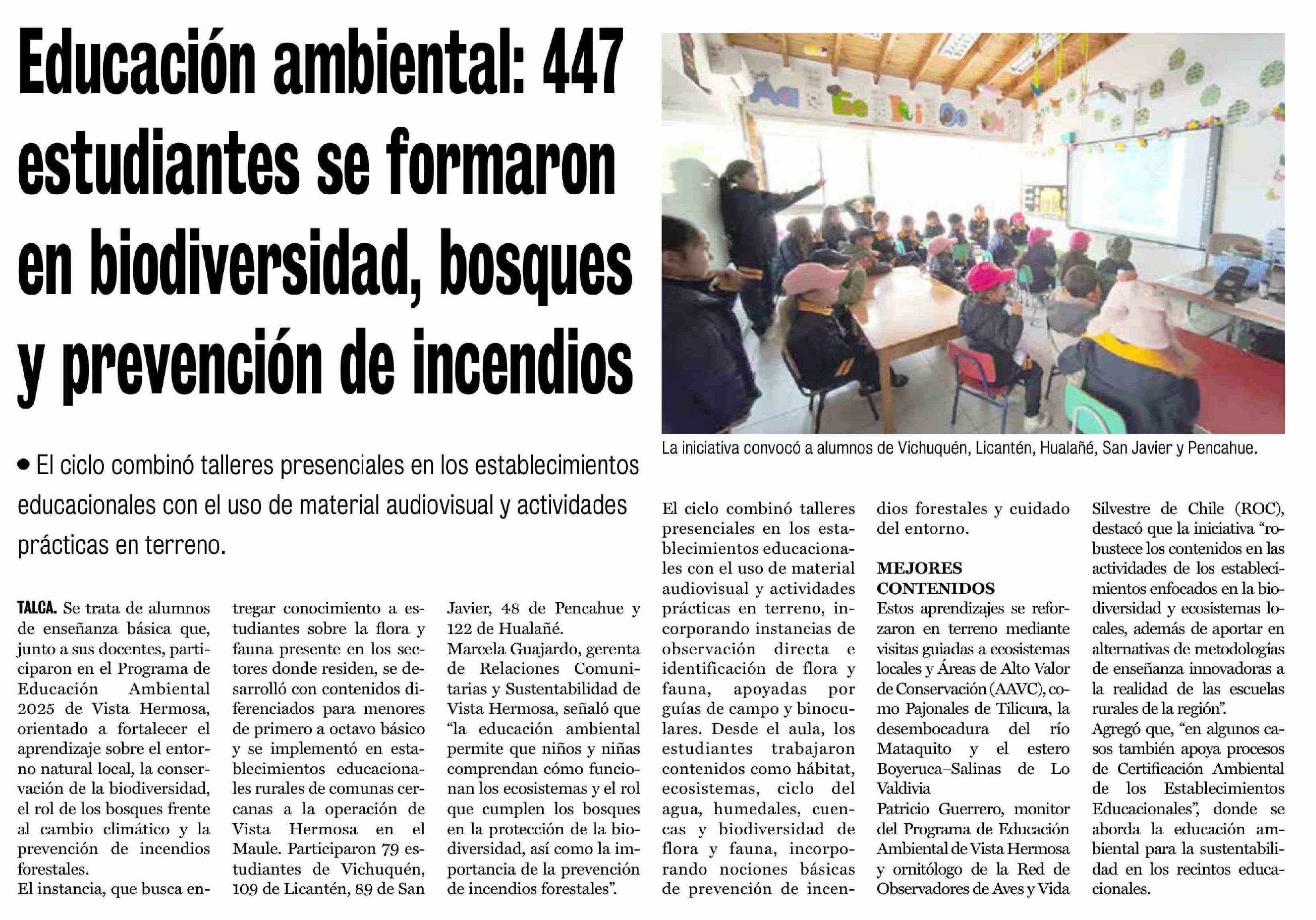 Educación ambiental: 447 estudiantes se formaron en biodiversidad, bosques y prevención de incendios 14-02-2026 La Prensa de Curicó |