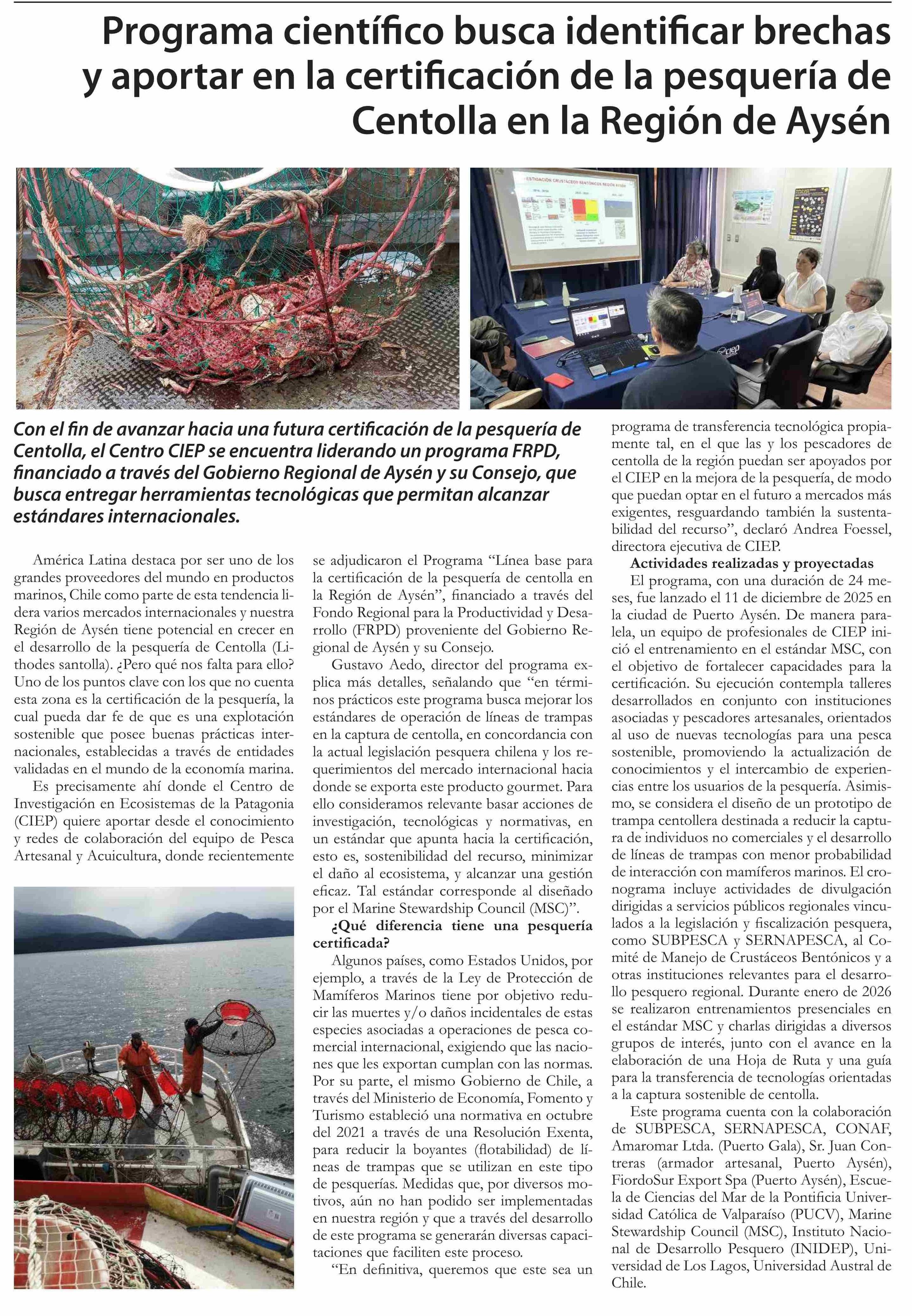 Título: Programa científico busca identificar brechas y aportar en la certificación de la pesquería de Centolla en la Región de Aysén