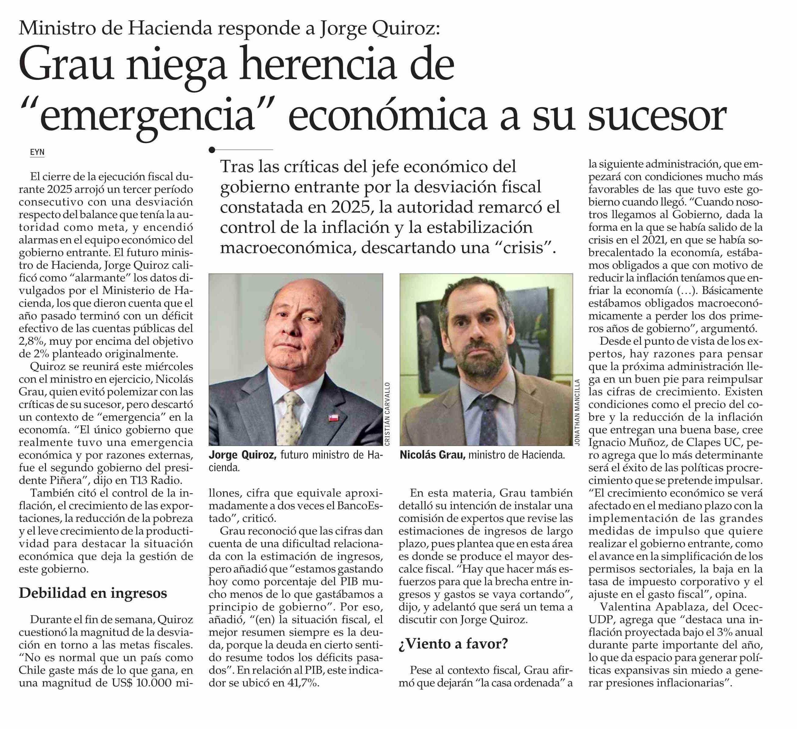 Grau niega herencia de “emergencia” económica a su sucesor 03-02-2026 El Mercurio |