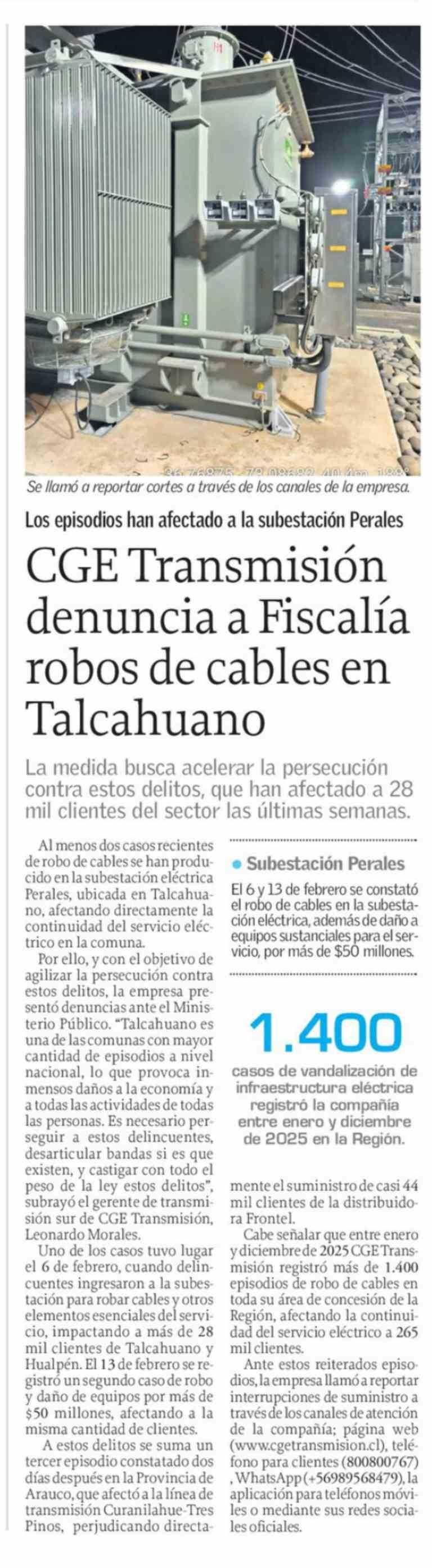 CGE Transmisión denuncia a Fiscalía robos de cables en Talcahuano 18-02-2026 El Sur |