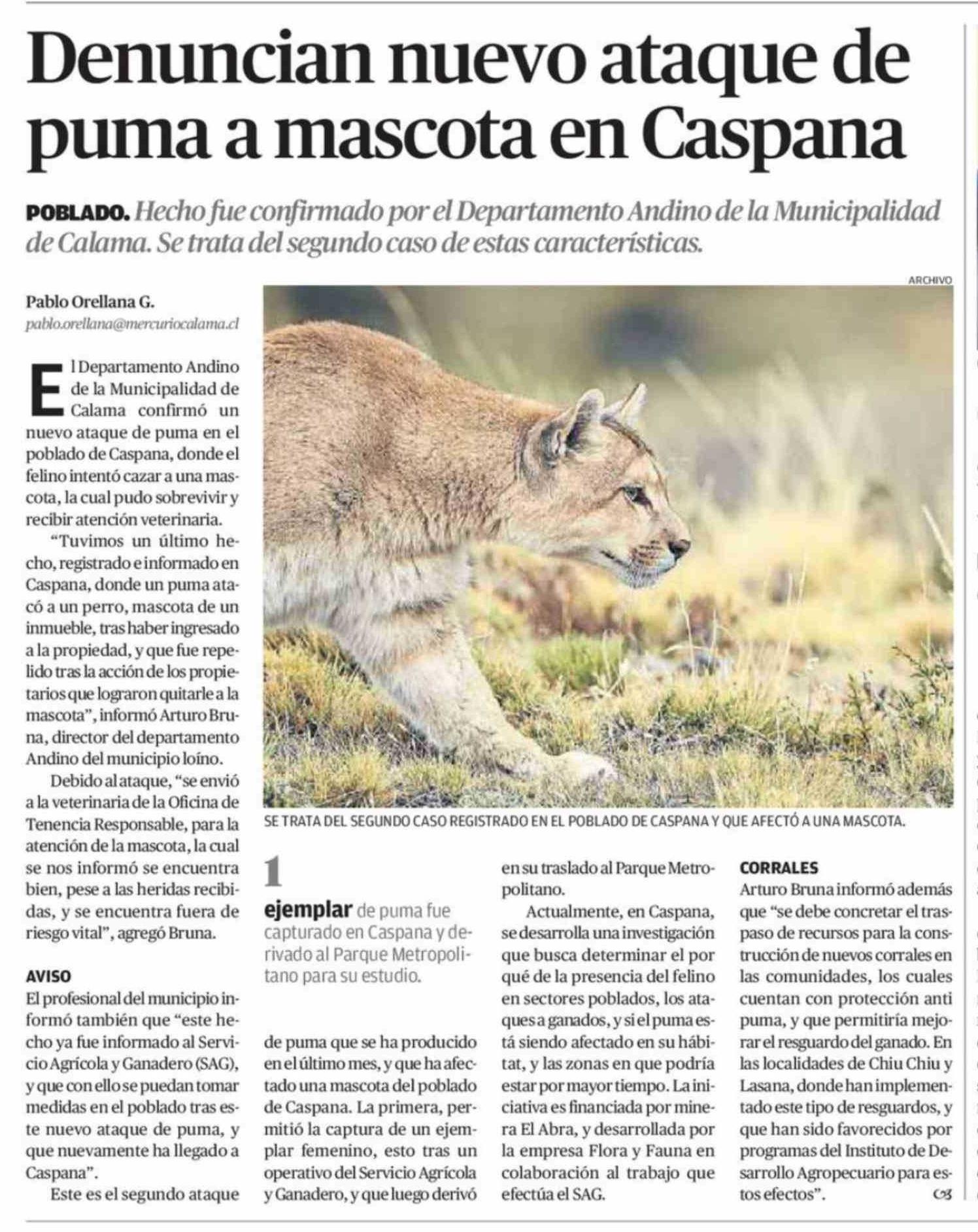 Denuncian nuevo ataque de puma a mascota en Caspana 17-02-2026 El Mercurio de Calama |