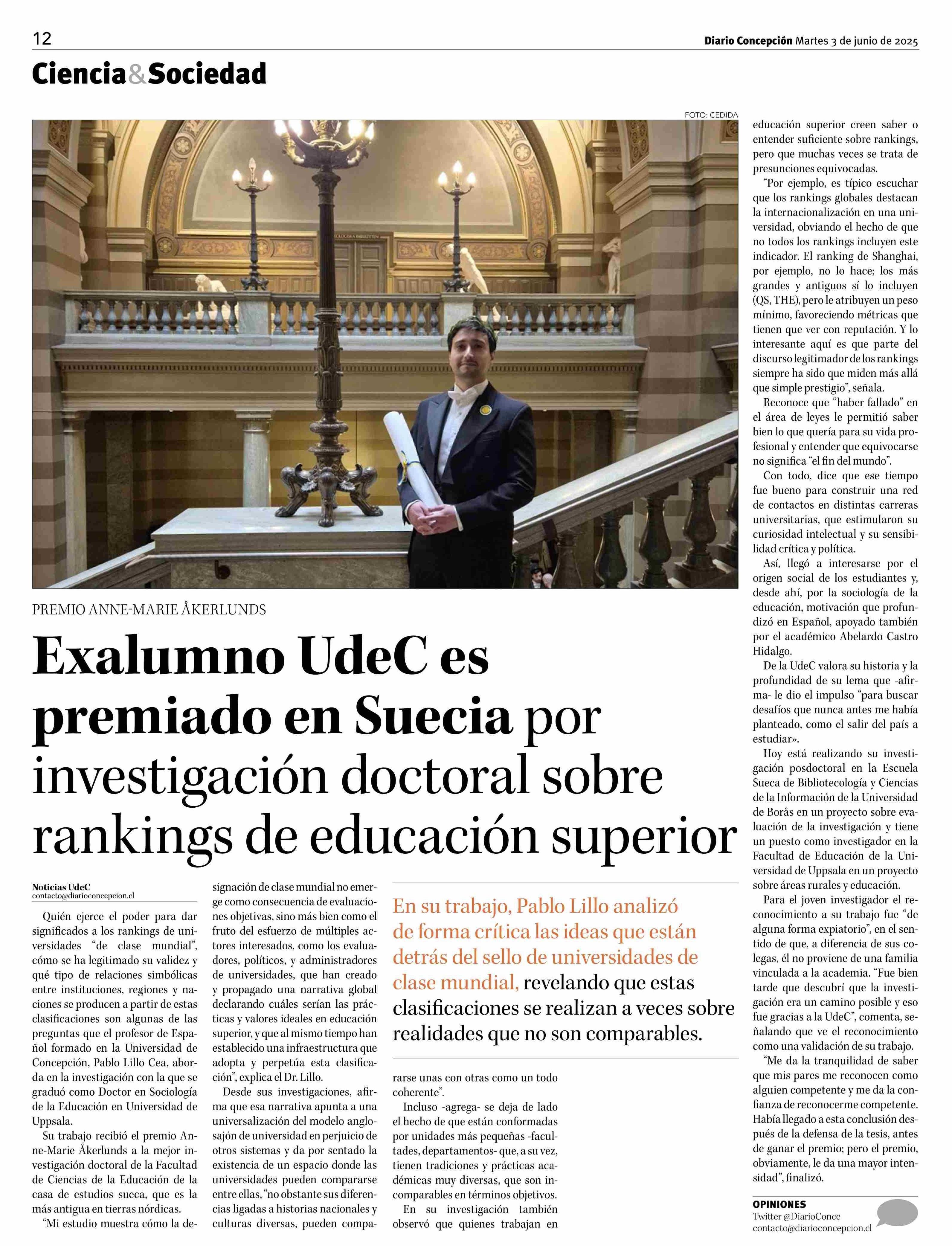 Exalumno UdeC es premiado en Suecia por investigación doctoral sobre rankings de educación superior 03-06-2025 Diario Concepción |