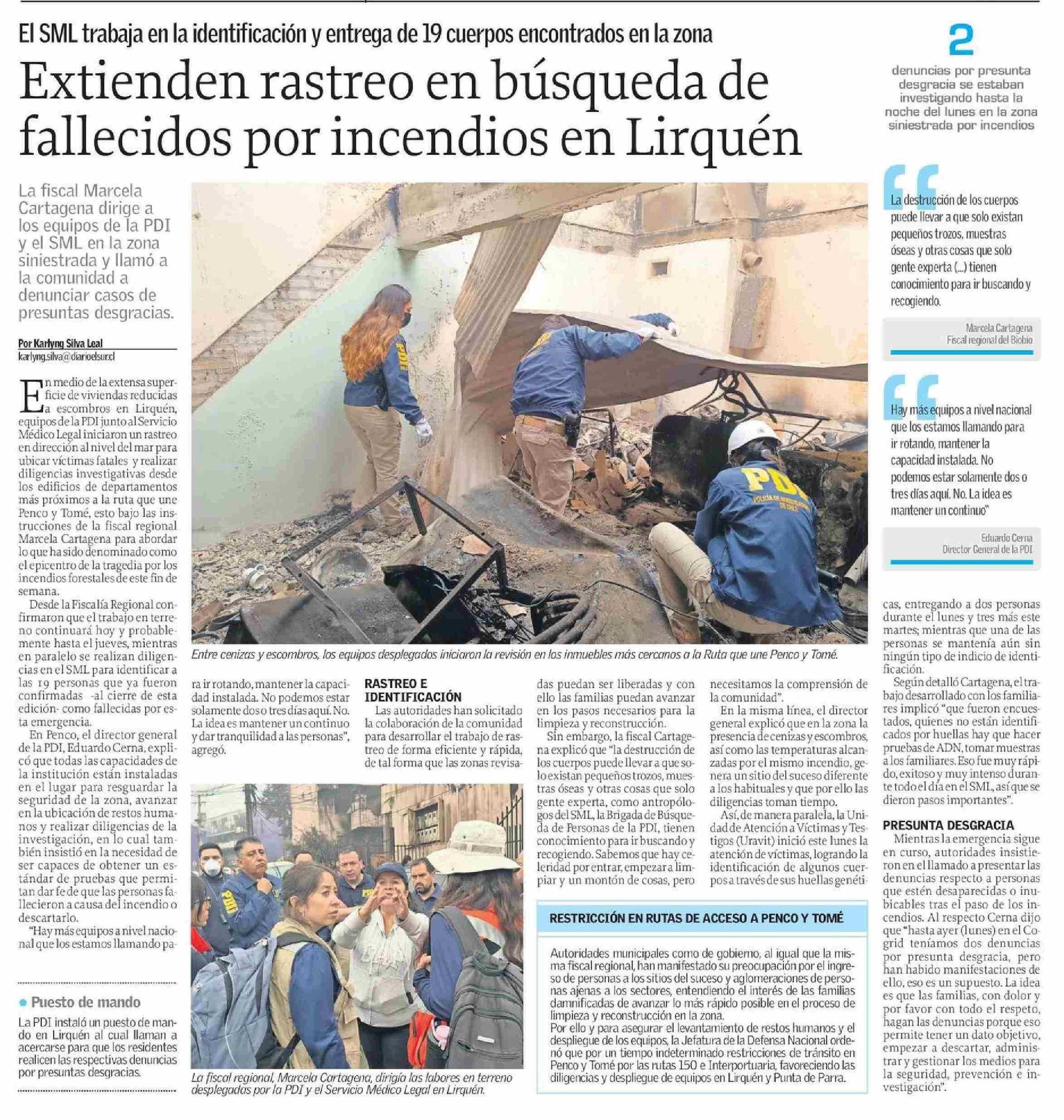 | Título: | Extienden rastreo en búsqueda de fallecidos por incendios en Lirquén |