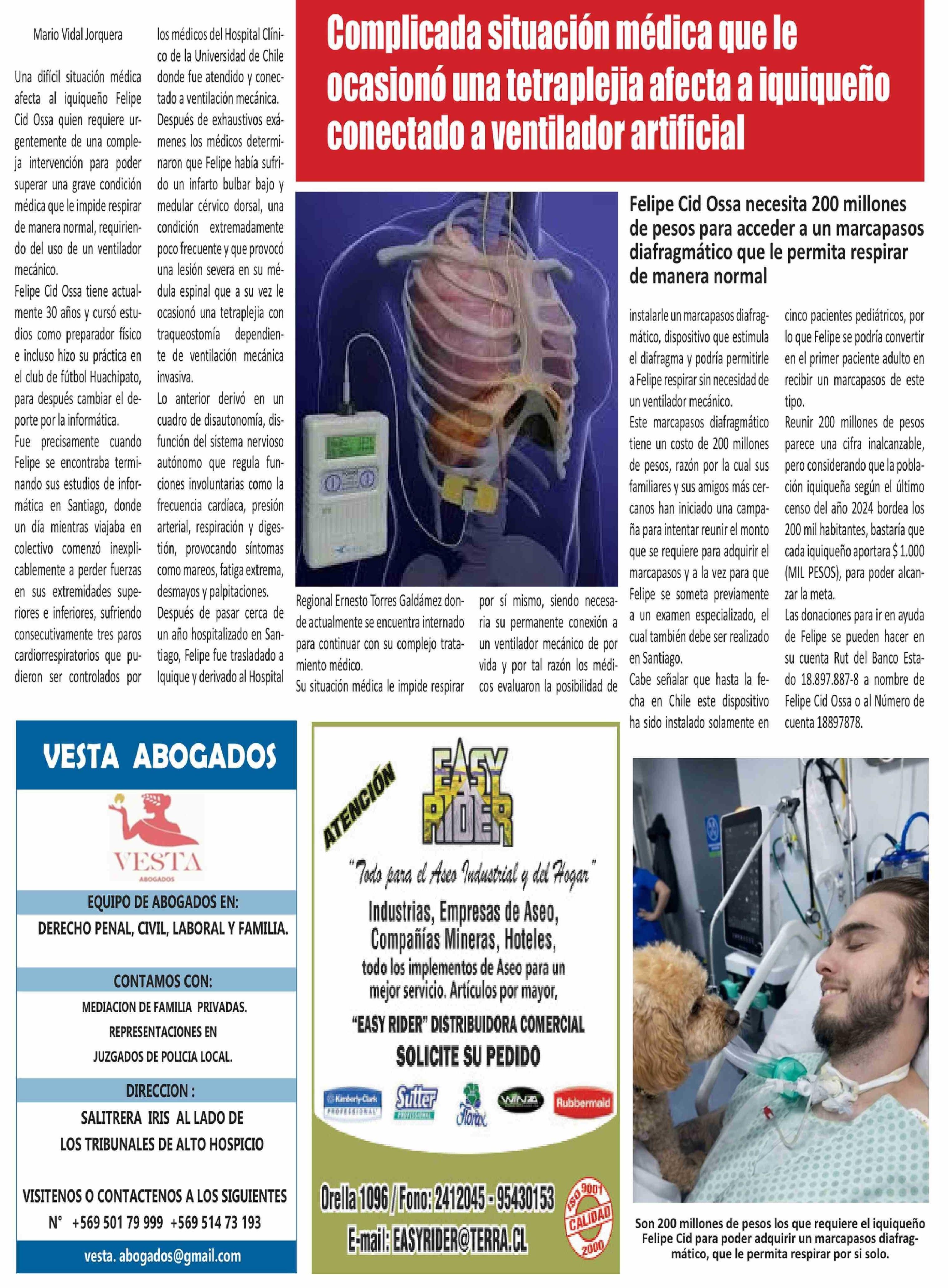 Título: Complicada situación médica que le ocasionó una tetraplejia afecta a iquiqueño conectado a ventilador artificial