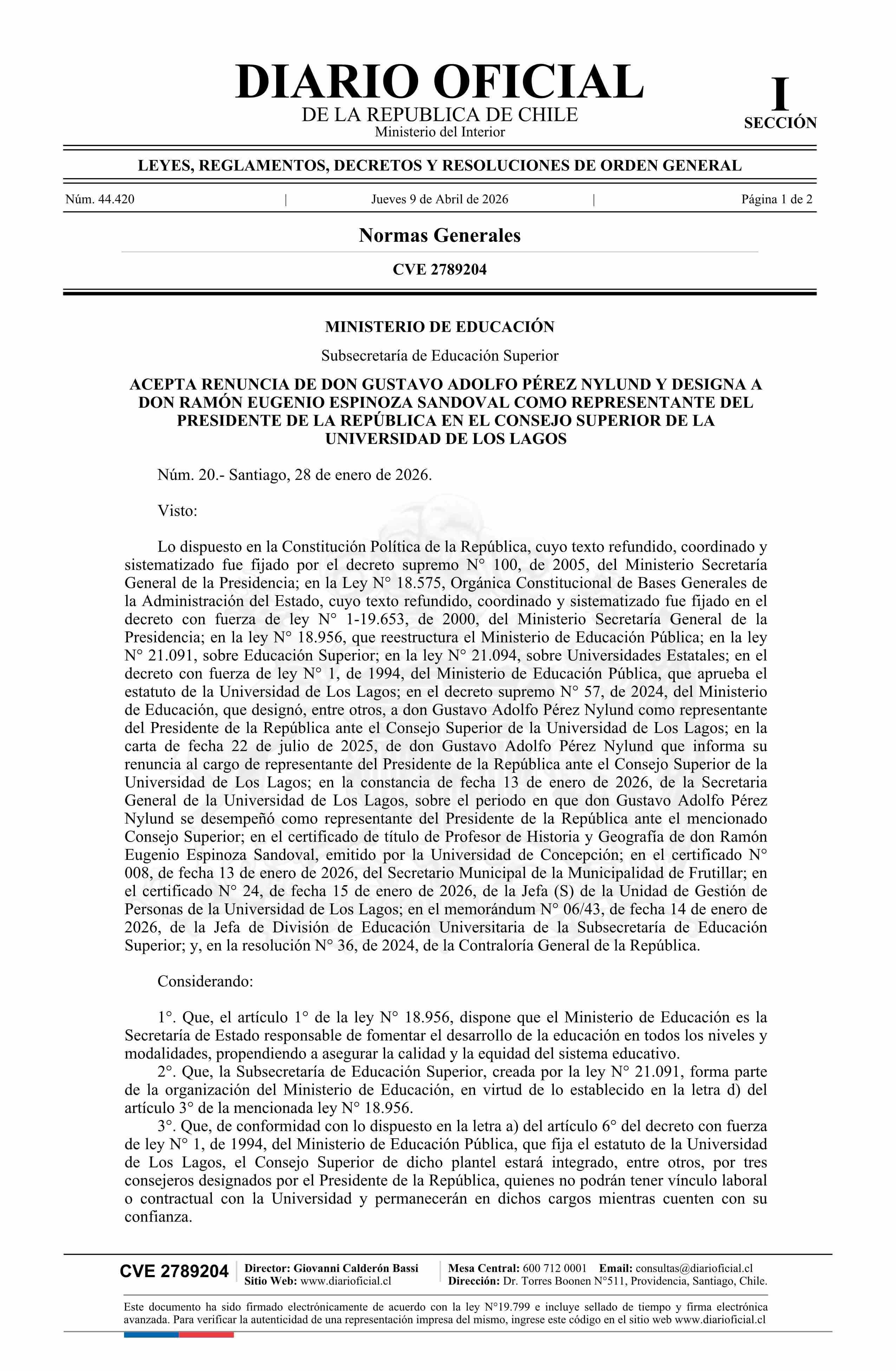 Título: Decreto número 20, de 2026.- Acepta renuncia de don Gustavo Adolfo Pérez Nylund y designa a don Ramón Eugenio Espinoza Sandoval como representante del Presidente de la República en el Consejo Superior de la Universidad de Los Lagos