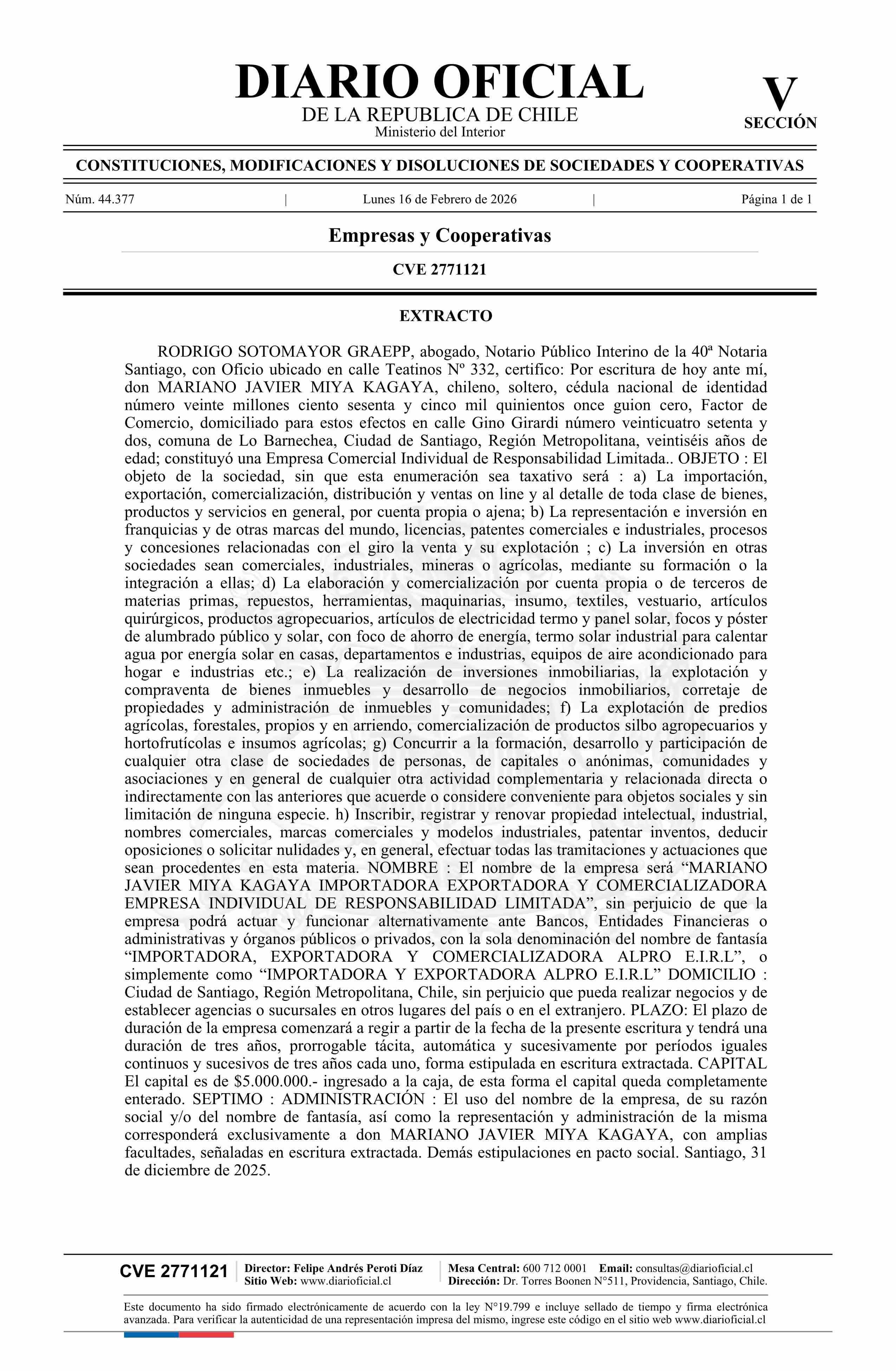 MARIANO JAVIER MIYA KAGAYA IMPORTADORA EXPORTADORA Y COMERCIALIZADORA EMPRESA INDIVIDUAL DE RESPONSABILIDAD LIMITADA 16-02-2026 Diario Oficial Edición Electrónica |