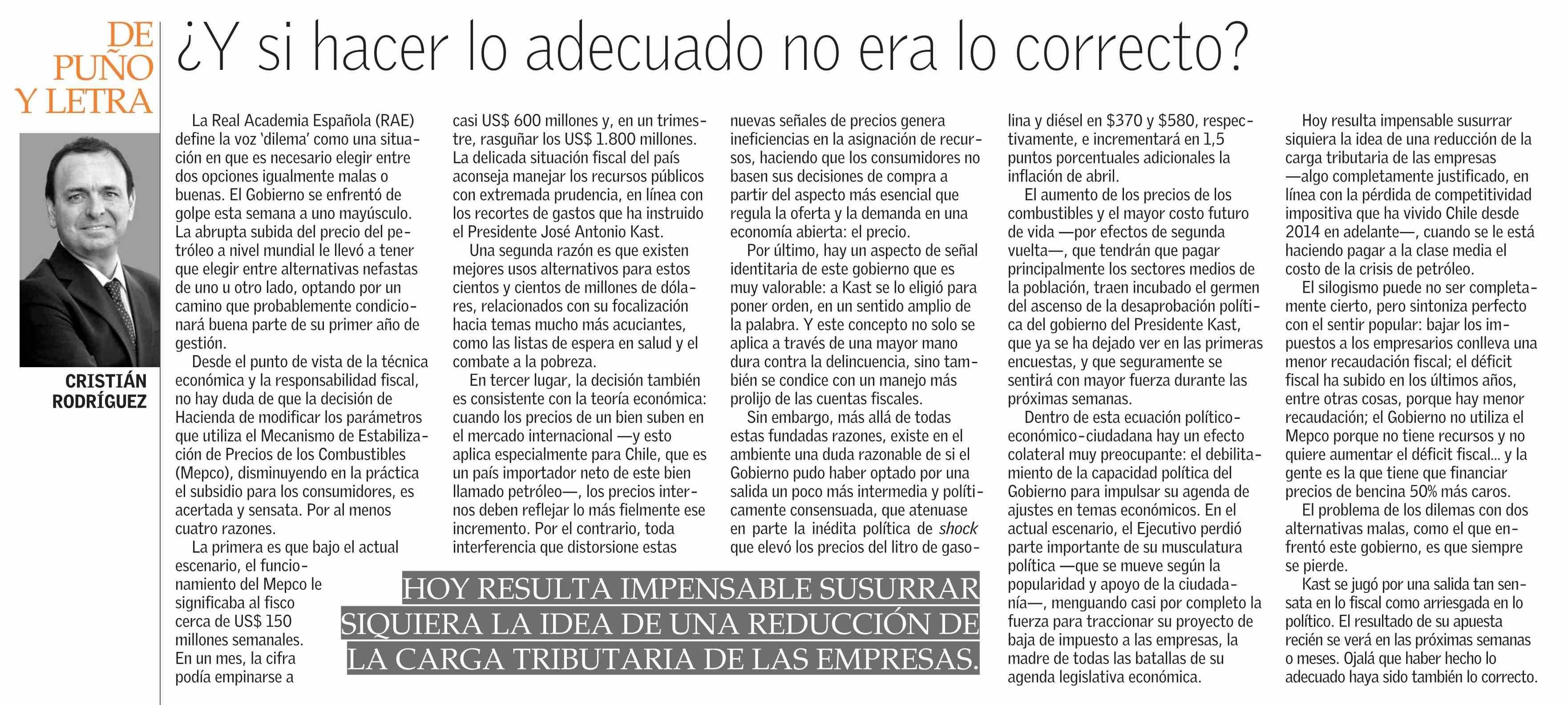 Columnas de Opinión: DE PUÑO ¿Y si hacer lo adecuado no era lo correcto? 28-03-2026 El Mercurio |
