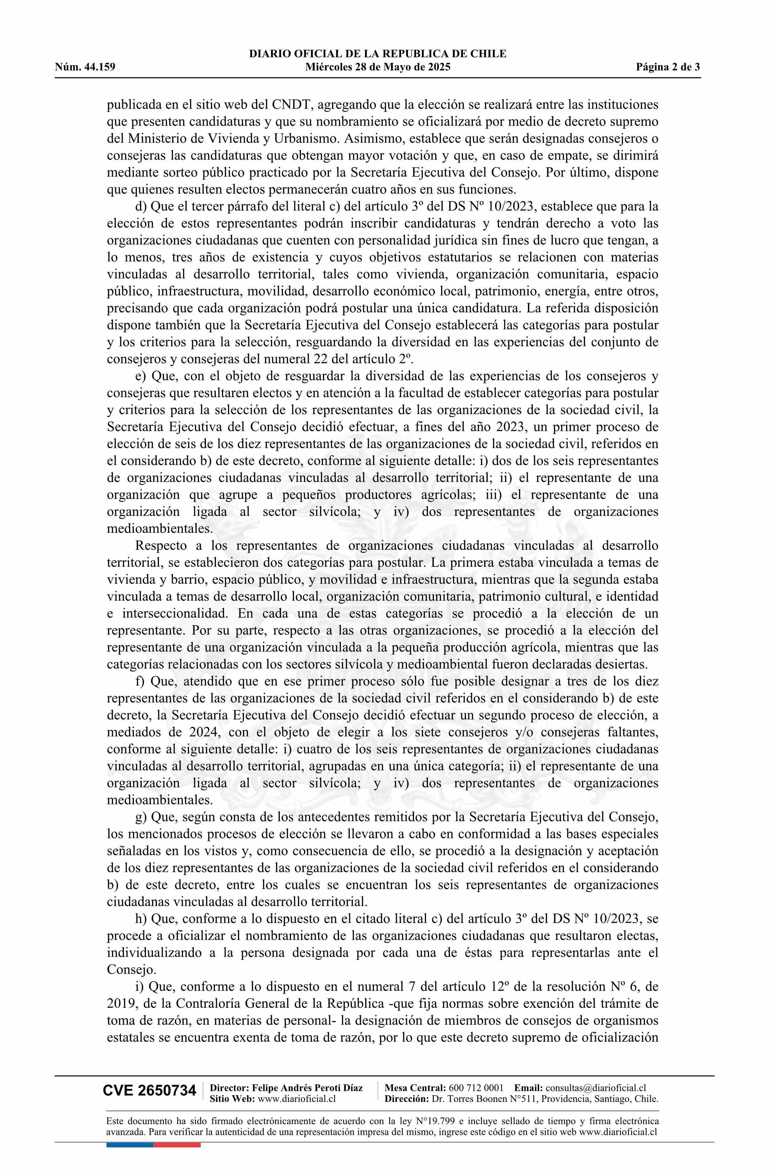 Decreto exento número 82, de 2024.- Oficializa el nombramiento de seis representantes de organizaciones ciudadanas vinculadas al desarrollo territorial en el Consejo Nacional de Desarrollo Territorial 28-05-2025 DIARIO OFICIAL CHILE - BOLETÍN OFICIAL DE MINERÍA |
