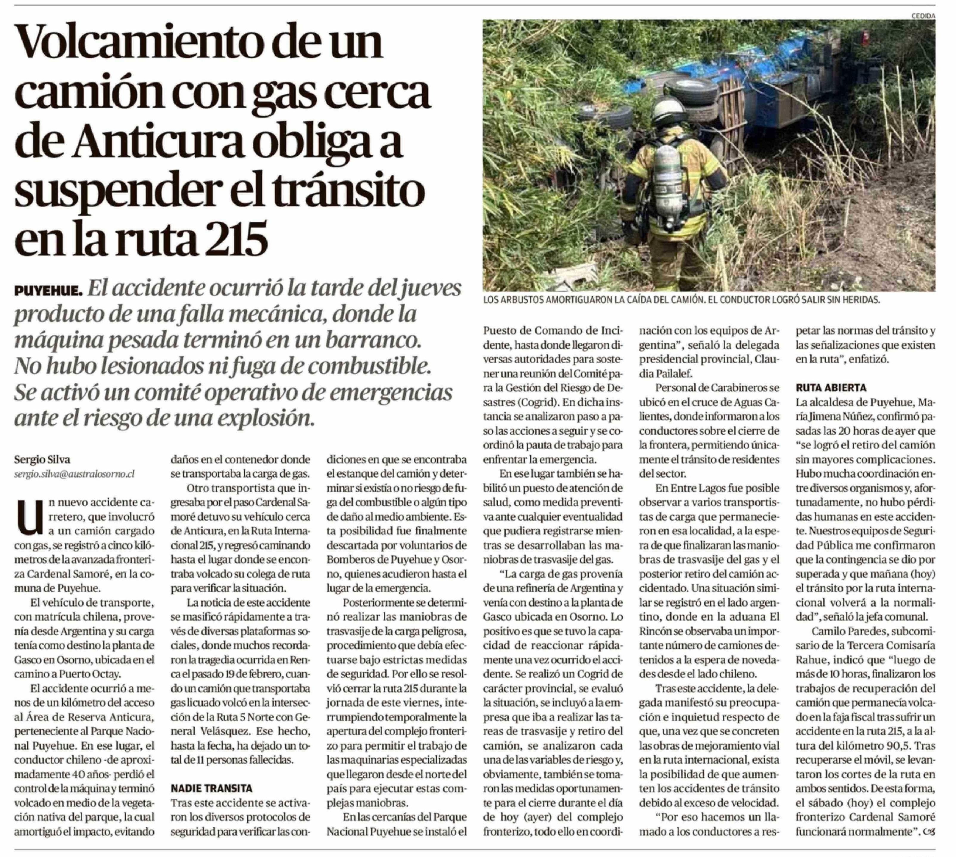 Título: Volcamiento de un camión con gas cerca de Anticura obliga a suspender el tránsito en la ruta 215