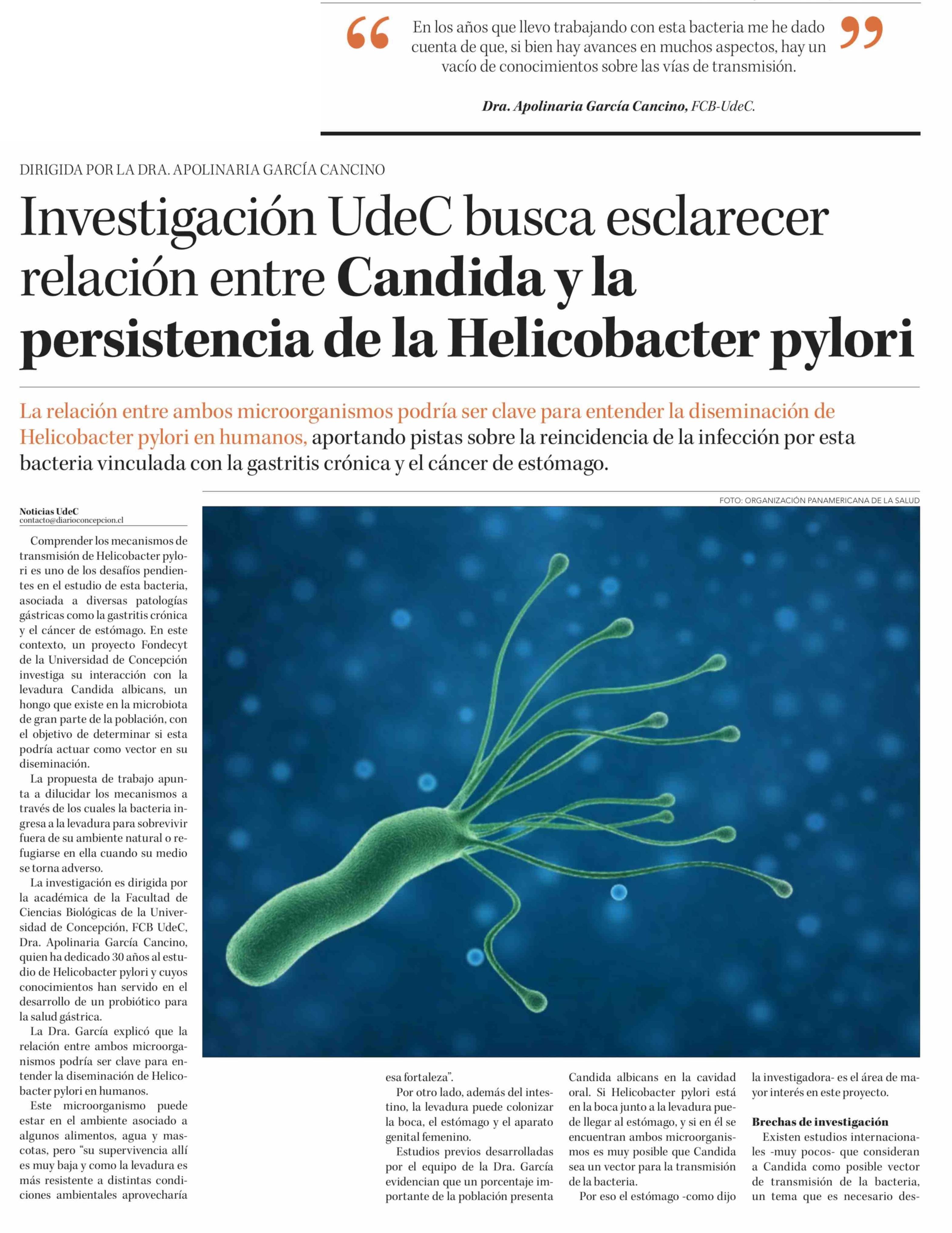 Investigación UdeC busca esclarecer relación entre Candida y la persistencia de la Helicobacter pylori 24-03-2026 Diario Concepción |