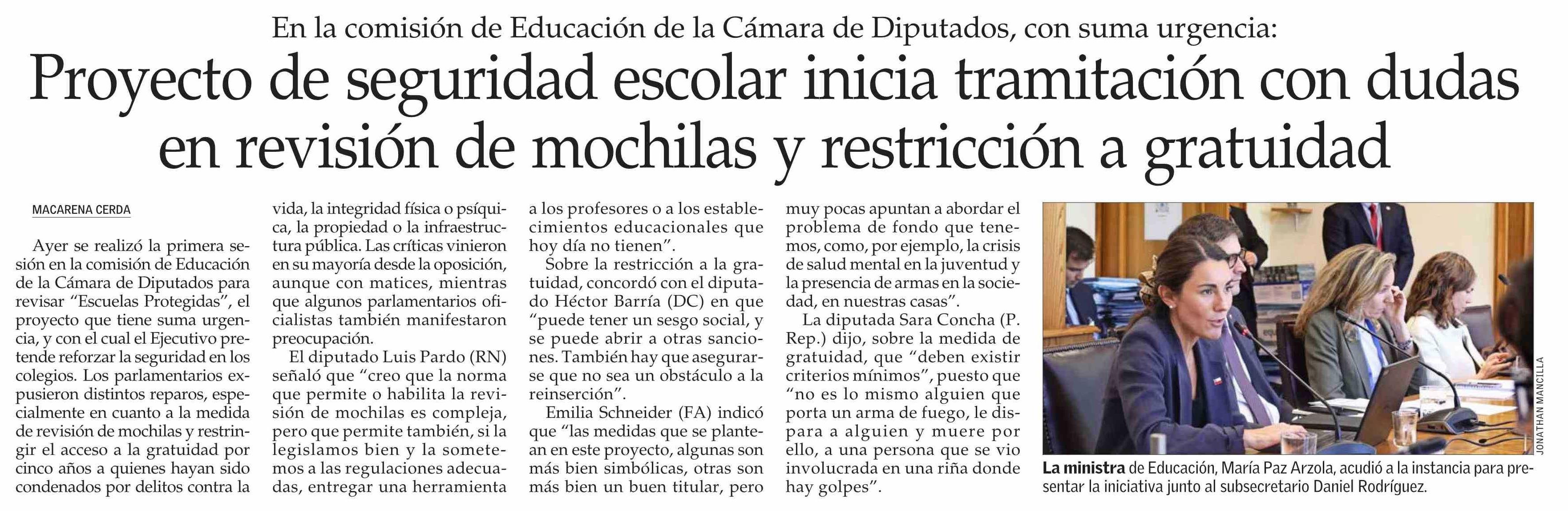Proyecto de seguridad escolar inicia tramitación con dudas en revisión de mochilas y restricción a gratuidad 09-04-2026 El Mercurio |