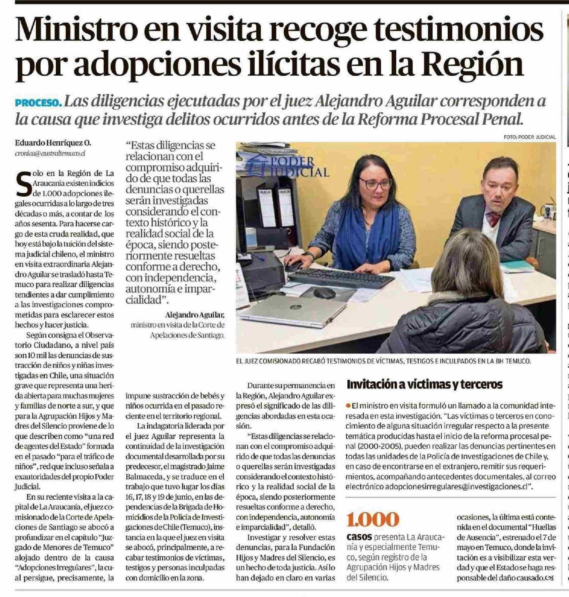 Ministro en visita recoge testimonios por adopciones ilícitas en la Región 21-06-2025 El Austral de la Araucanía |