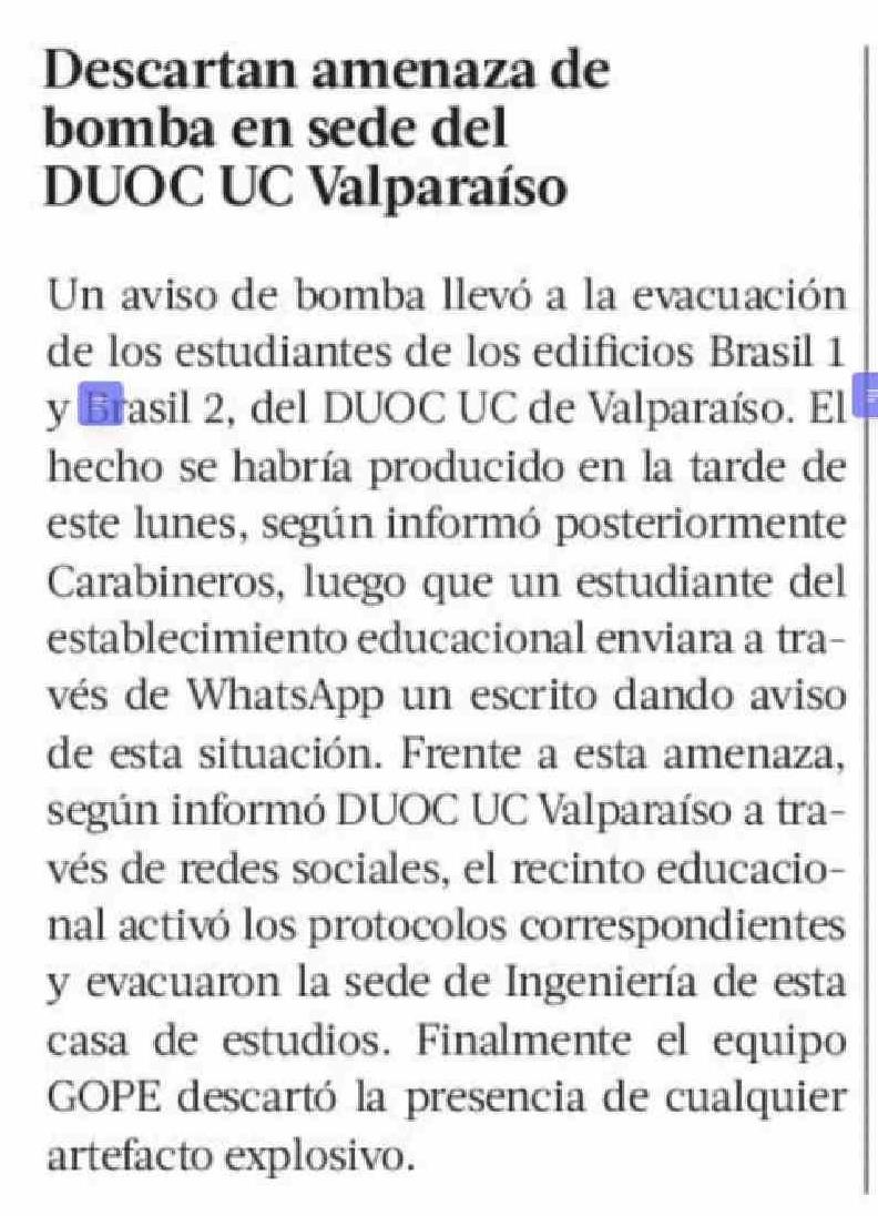 | Título: | Descartan amenaza de bomba en sede del DUOC UC Valparaíso |
