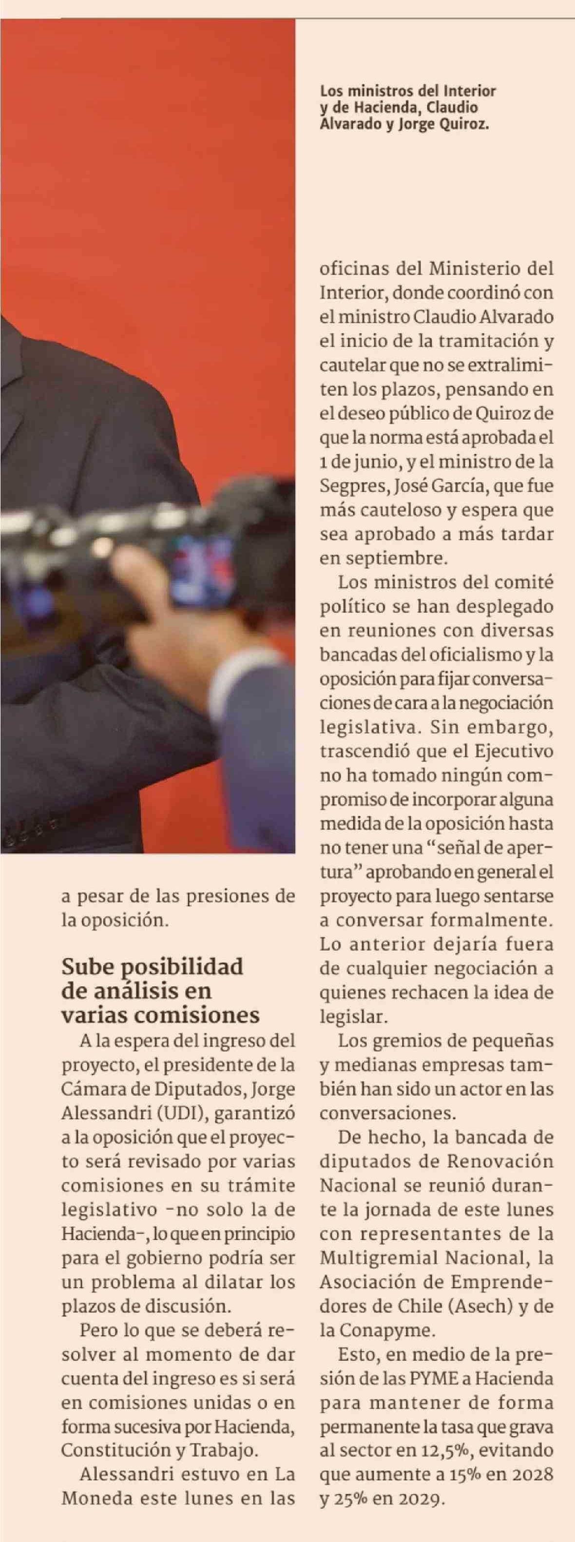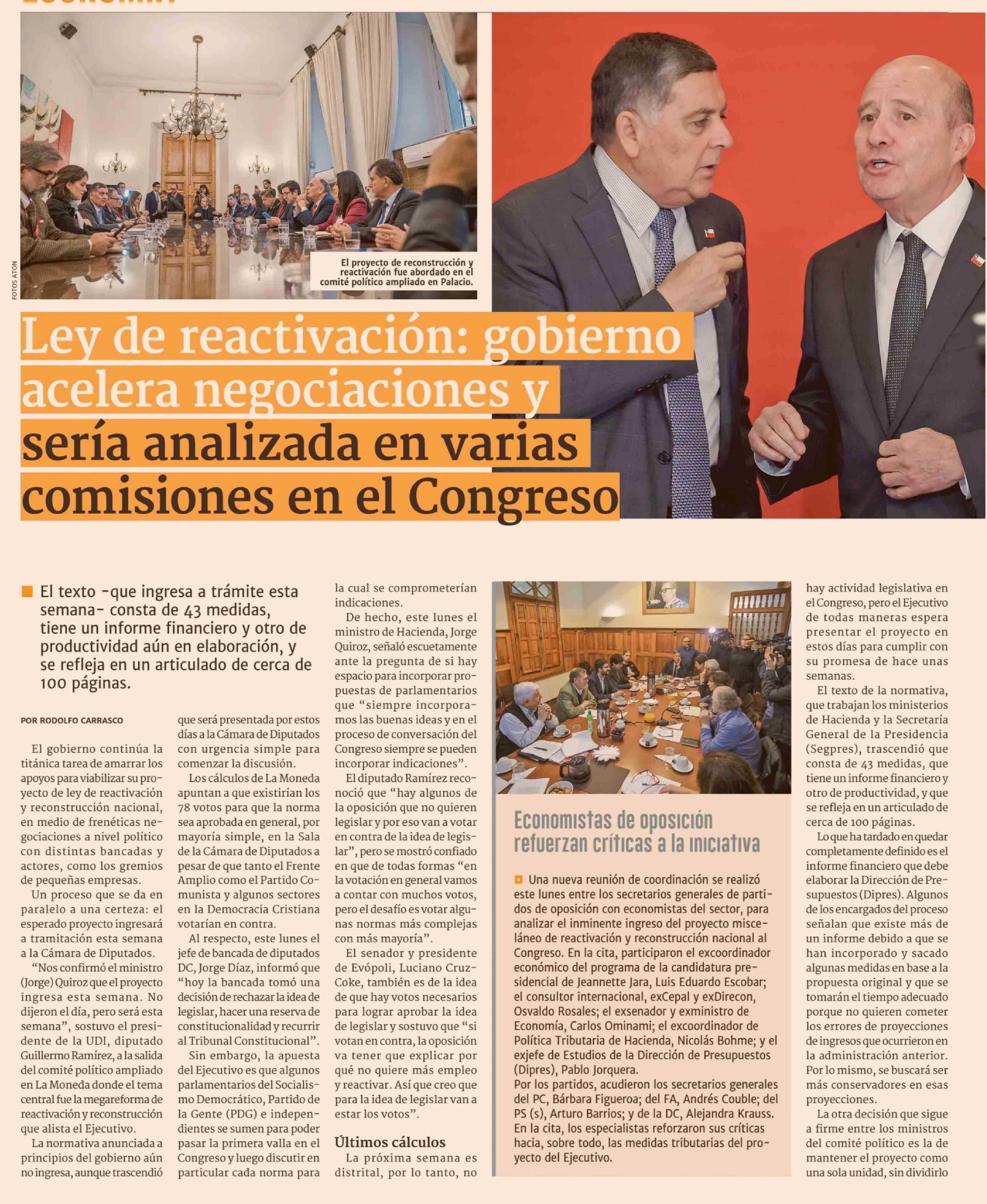 Ley de reactivación: gobierno acelera negociaciones y sería analizada en varias comisiones en el Congreso 21-04-2026 Diario Financiero |