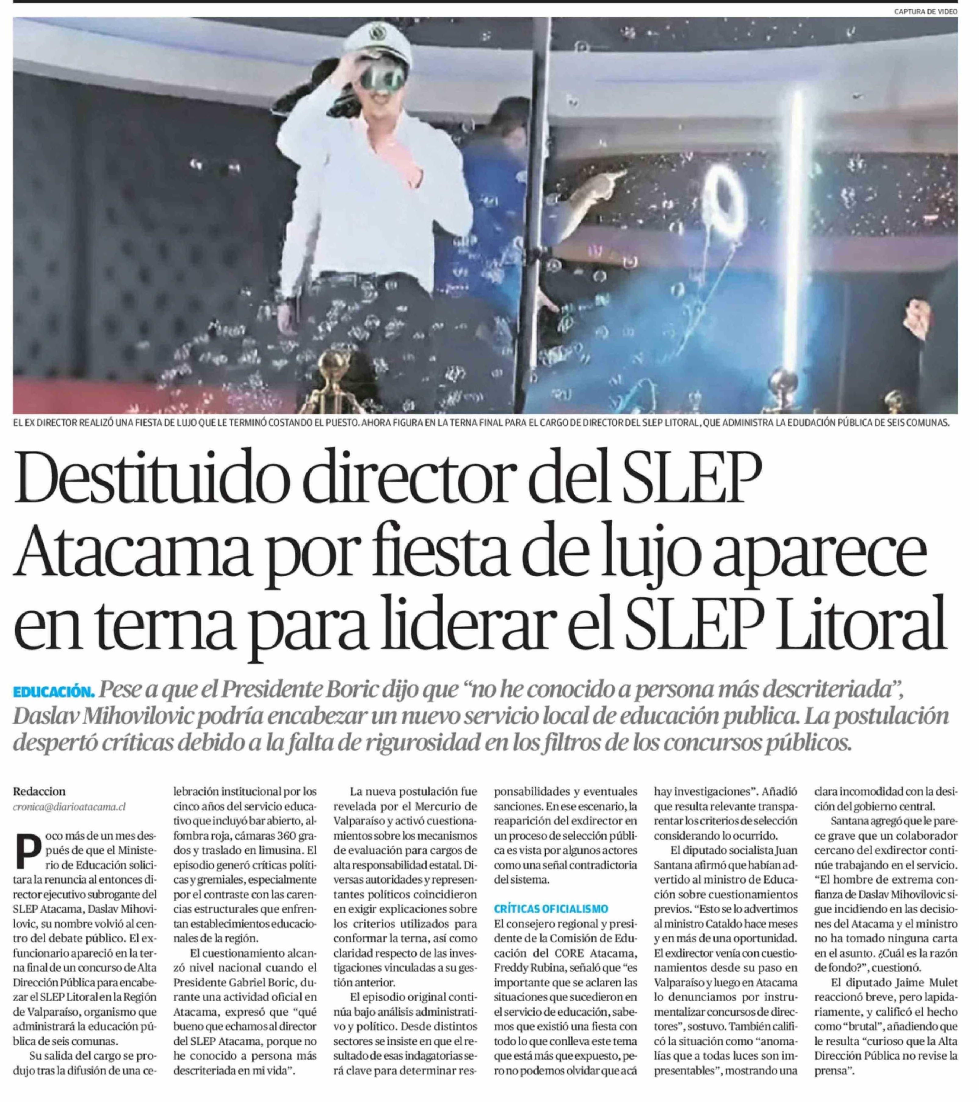 Destituido director del SLEP Atacama por fiesta de lujo aparece en terna para liderar el SLEP Litoral 13-02-2026 El Diario de Atacama |