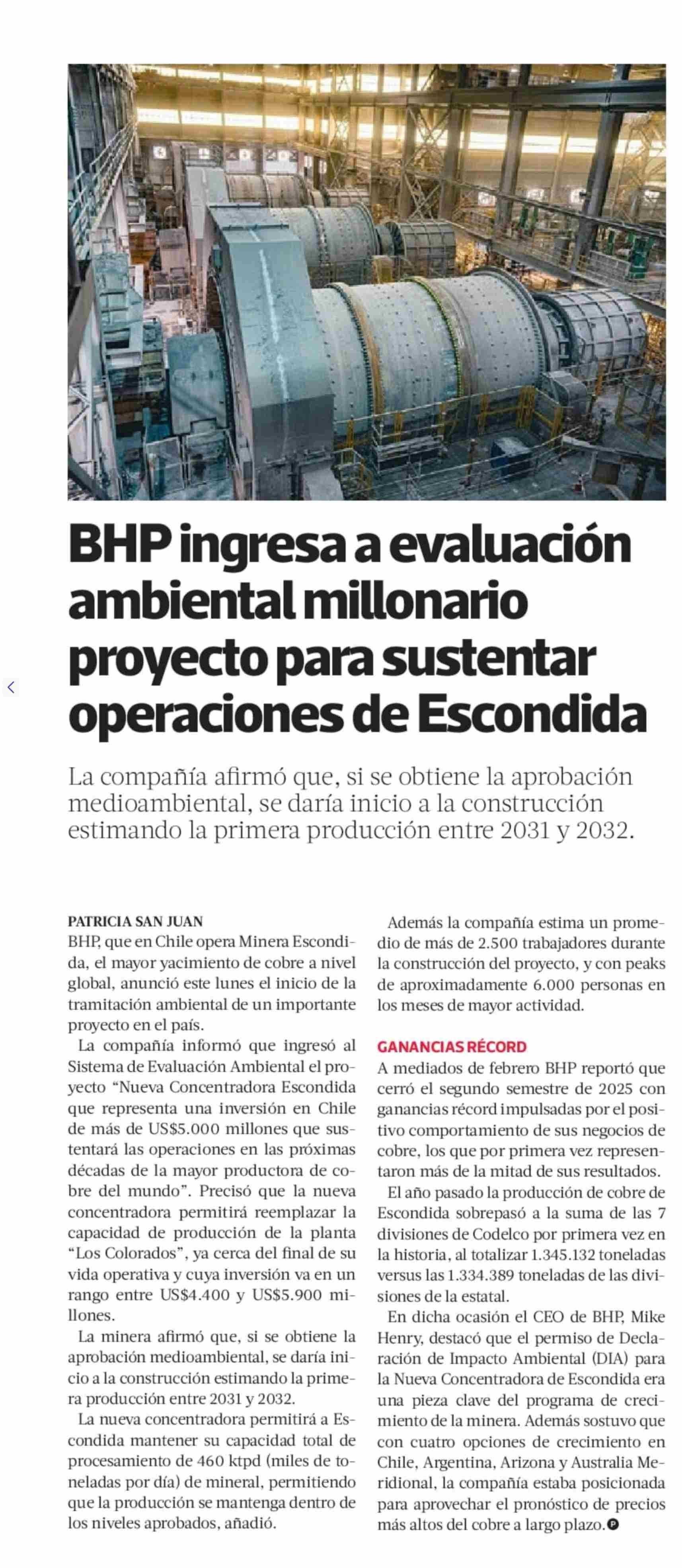 BHP ingresa a evaluación ambiental millonario proyecto para sustentar operaciones de Escondida 17-03-2026 La Tercera |