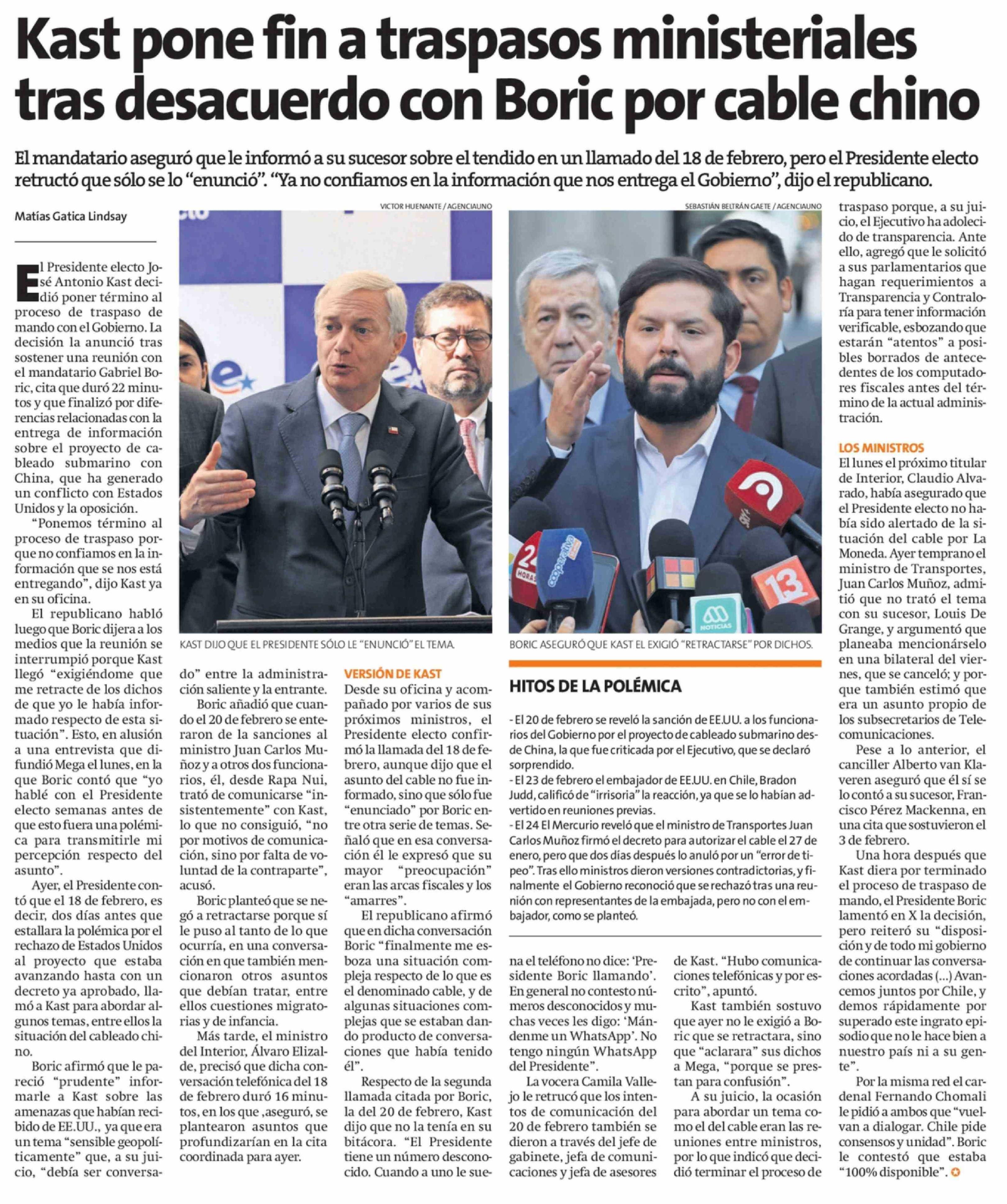 | Título: | Kast pone fin a traspasos ministeriales tras desacuerdo con Boric por cable chino |
