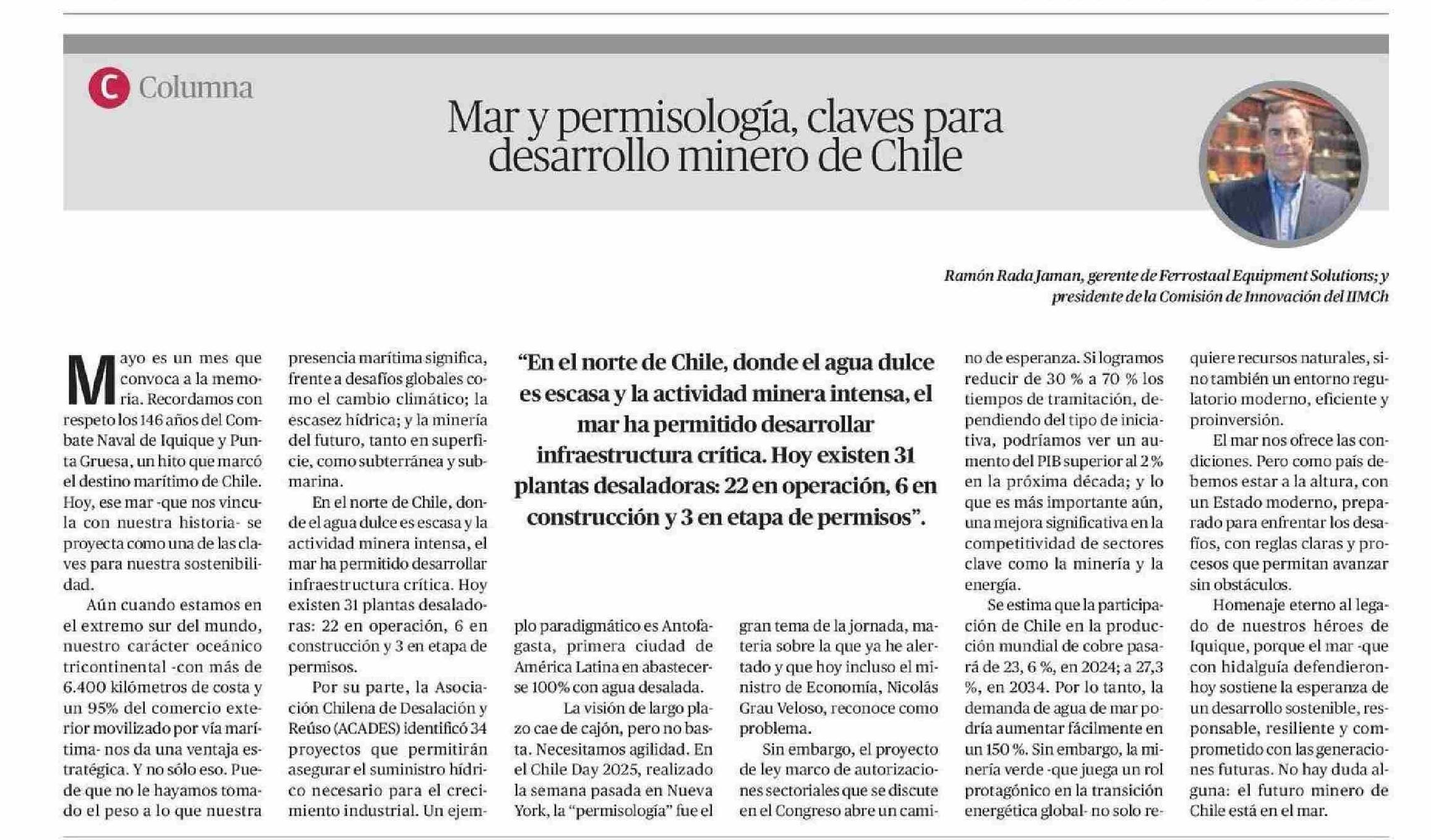 COLUMNAS DE OPINIÓN: Mar y permisología, claves para desarrollo minero de Chile 26-05-2025 El Mercurio de Calama |