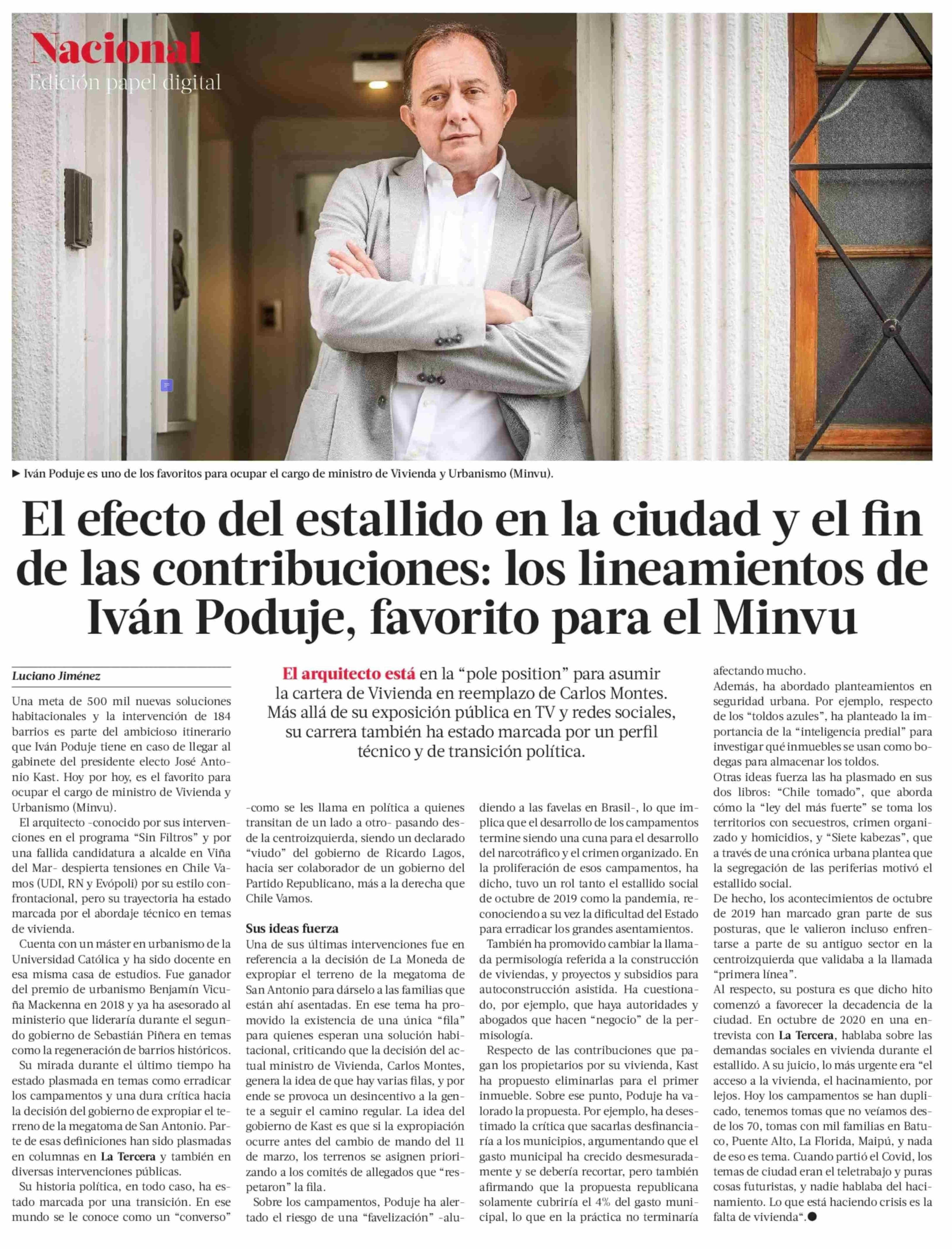 El efecto del estallido en la ciudad y el fin de las contribuciones: los lineamientos de Iván Poduje, favorito para el Minvu 14-01-2026 La Tercera |