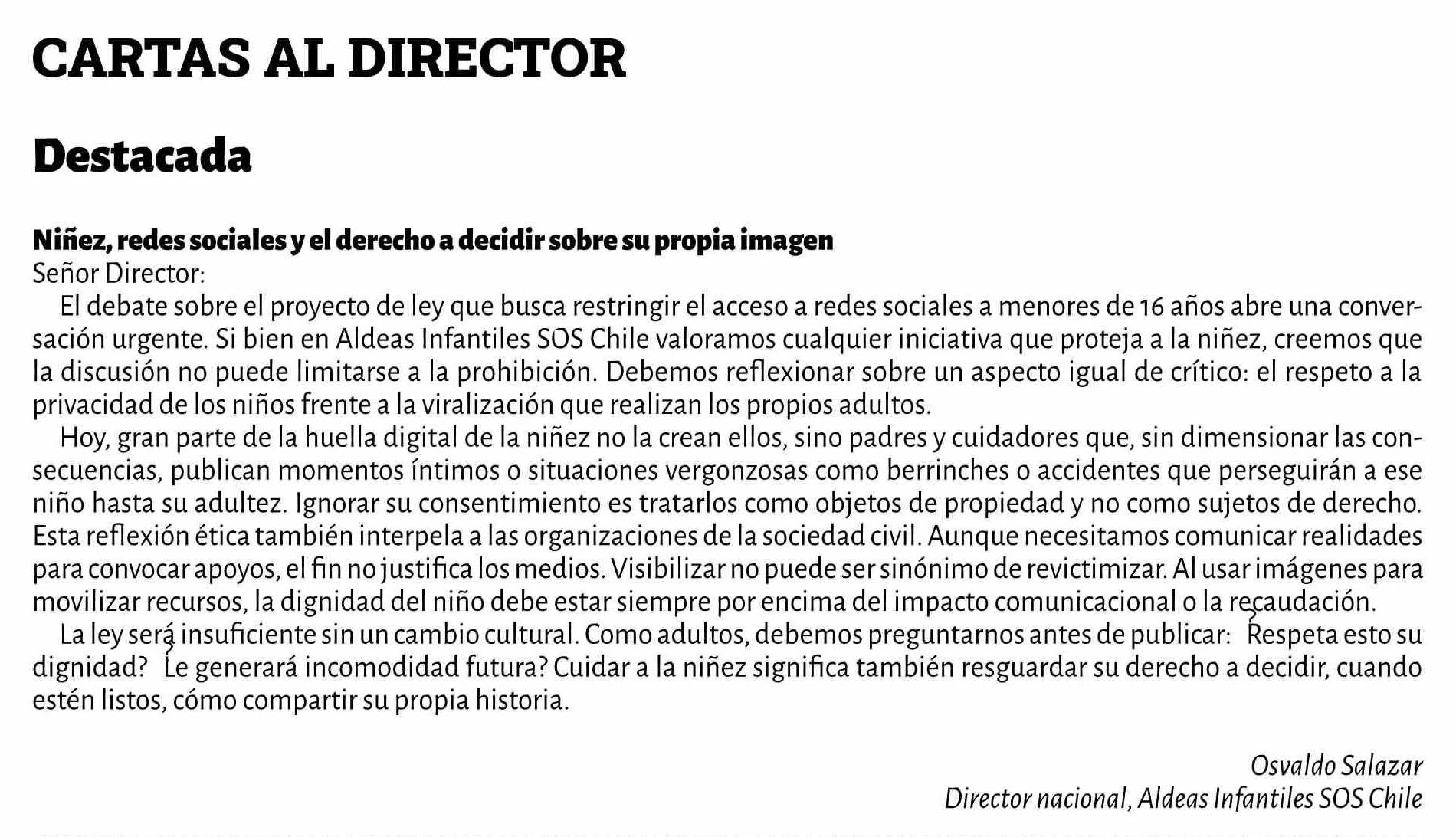 | Título: | Cartas: Niñez, redes sociales y el derecho a decidir sobre su propia imagen Señor Director: El debate sobre el proyecto de ley que busca restringir el acceso a redes sociales a menores de 16 años abre una conversación urgente. Si bien en Aldeas Infantiles SOS Chile valoramos cualquier iniciativa que |