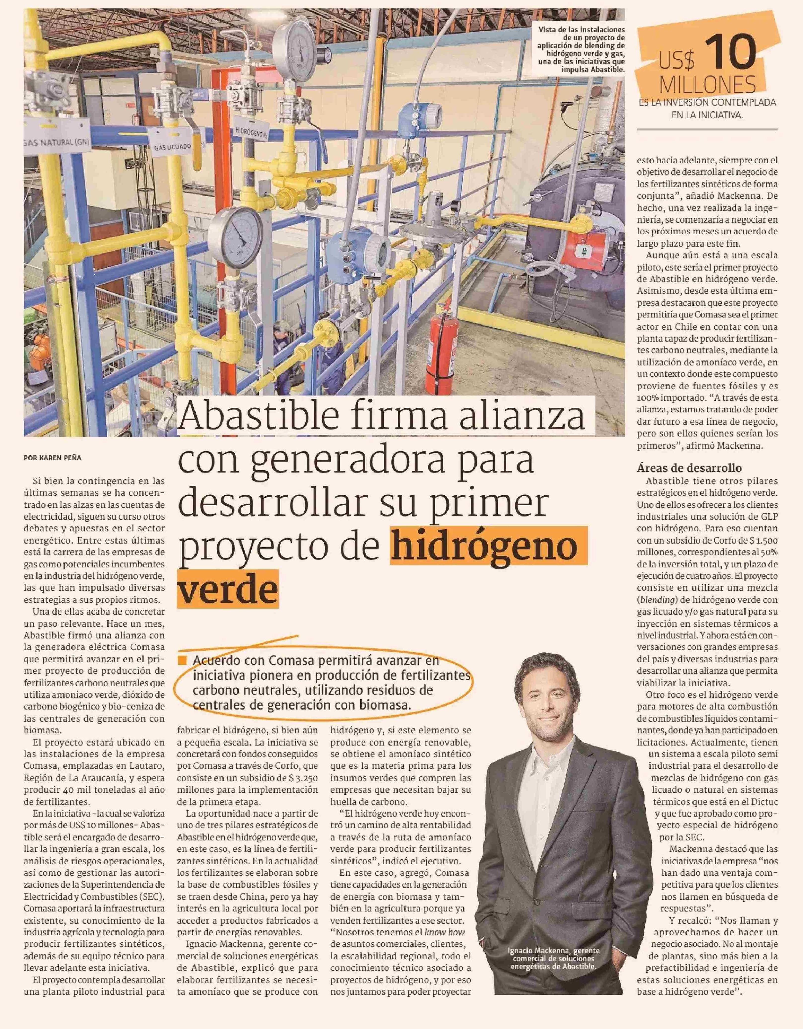 Abastible firma alianza con generadora para desarrollar su primer proyecto de hidrógeno verde 08-07-2024 Diario Financiero |