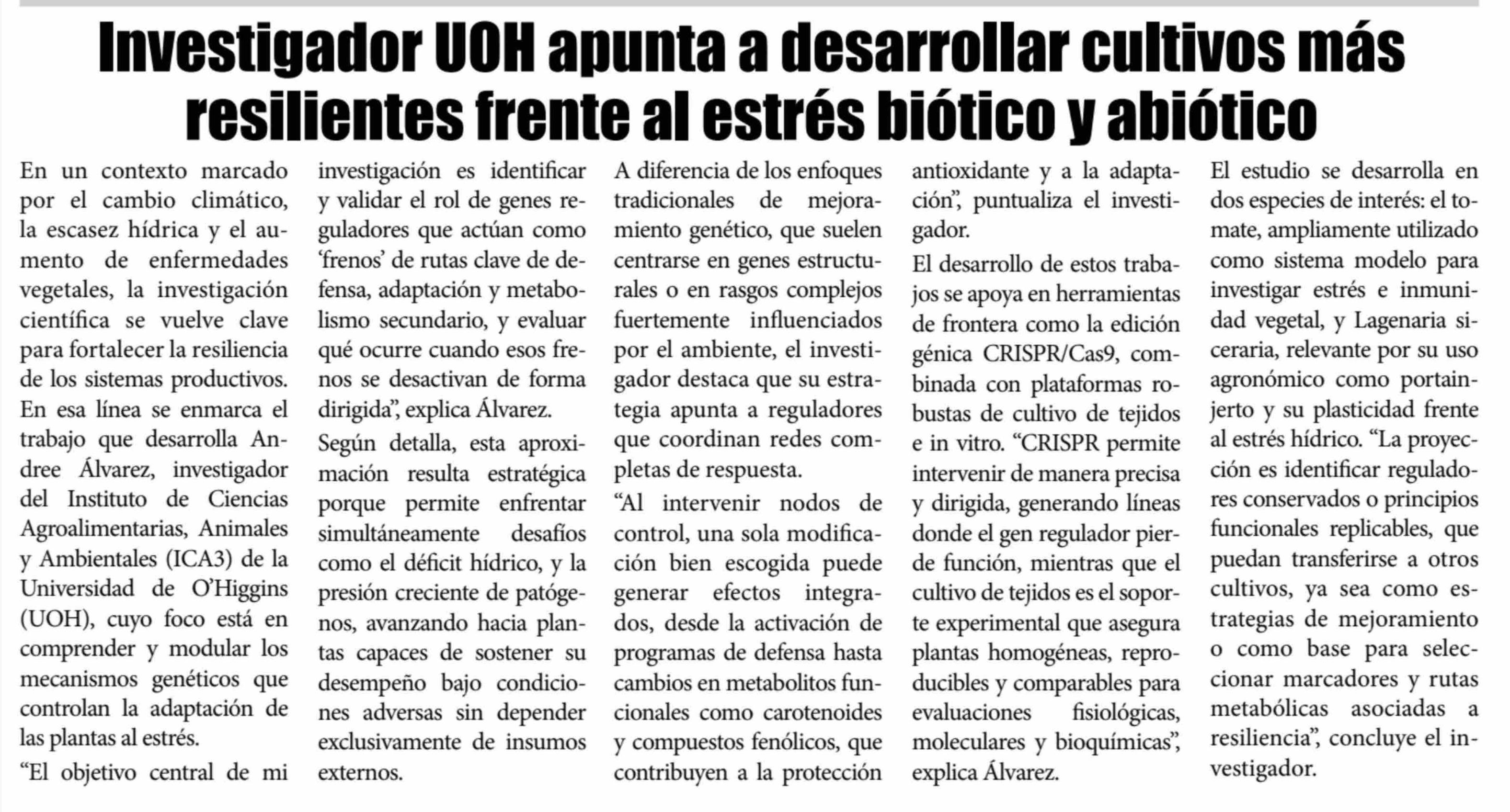 Título: Investigador UOH apunta a desarrollar cultivos más resilientes frente al estrés biótico y abiótico