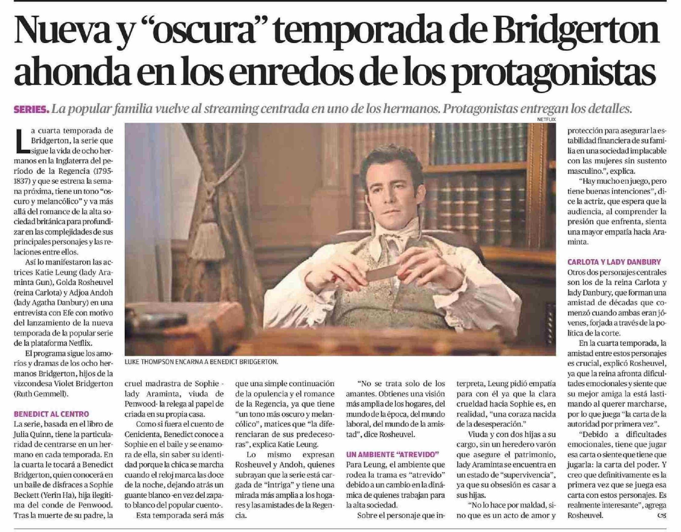 Nueva y "oscura" temporada de Bridgerton ahonda en los enredos de los protagonistas 24-01-2026 El Mercurio de Calama |