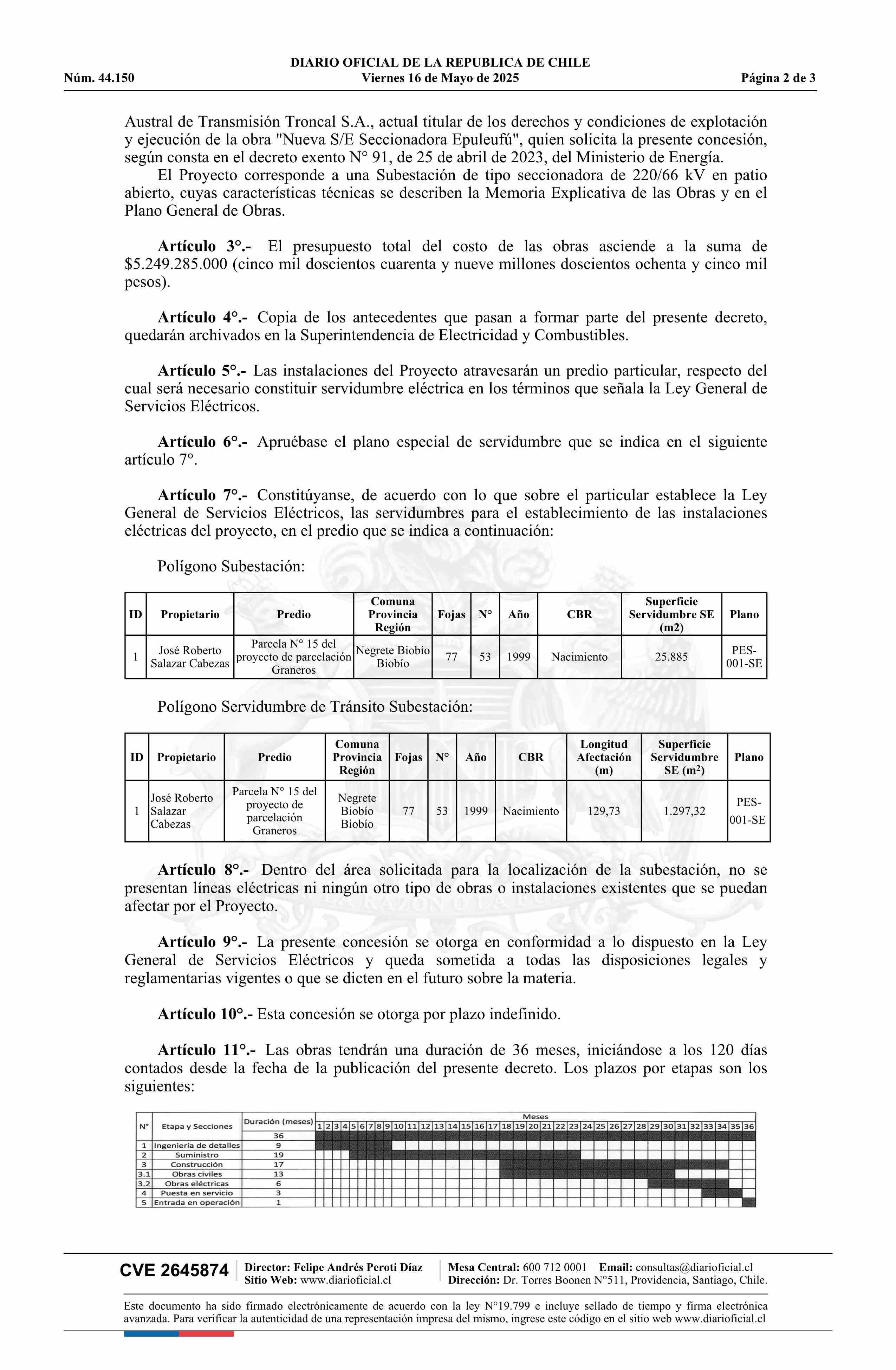 | Título: | Decreto número 6, de 2025.- Otorga a Sociedad Austral de Transmisión Troncal S.A. concesión eléctrica definitiva para establecer el proyecto denominado Nueva Subestación Epuleufú 220/66 kV, en la Región del Biobío, provincia de Biobío, comuna de Negrete |