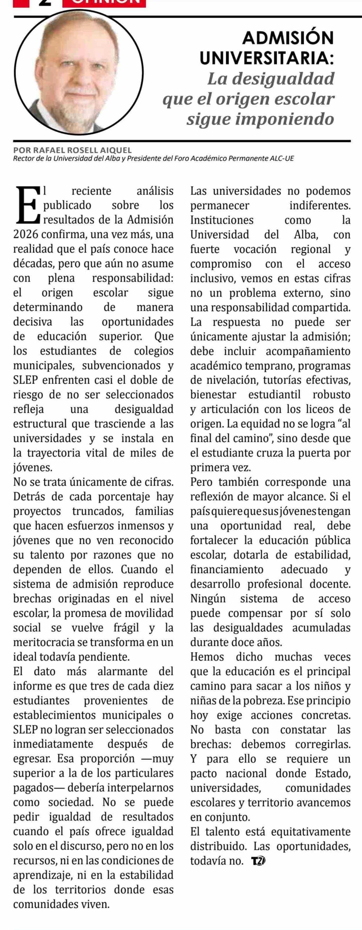 Título: Columnas de Opinión: resultados de la Admisión 2026 confirma, una vez más, una realidad que el país conoce hace décadas, pero que aún no asume con plena responsabilidad: el origen escolar sigue determinando de manera decisiva las oportunidades de educación superior. Que los estudiantes de colegios m