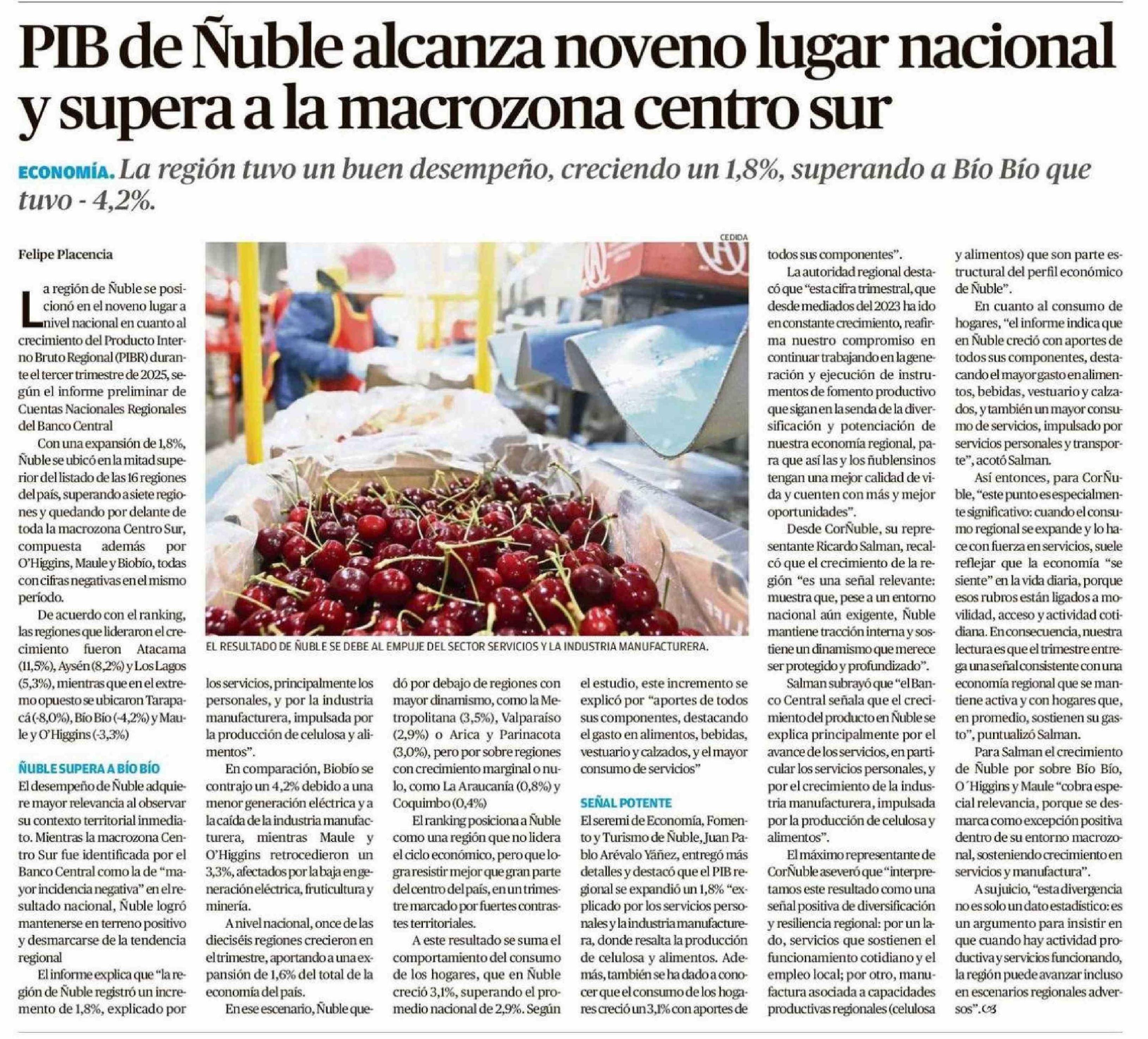 PIB de Ñuble alcanza noveno lugar nacional y supera a la macrozona centro sur 12-01-2026 Crónica de Chillán |
