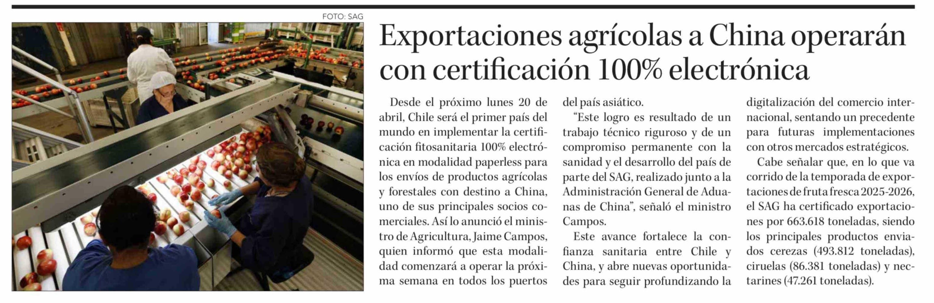 Título: Exportaciones agrícolas a China operarán con certificación 100% electrónica