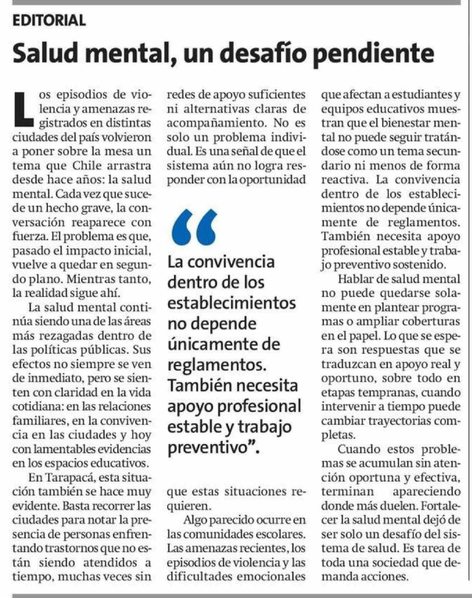 Editorial: Salud mental, un desafío pendiente 16-04-2026 La Estrella de Iquique |