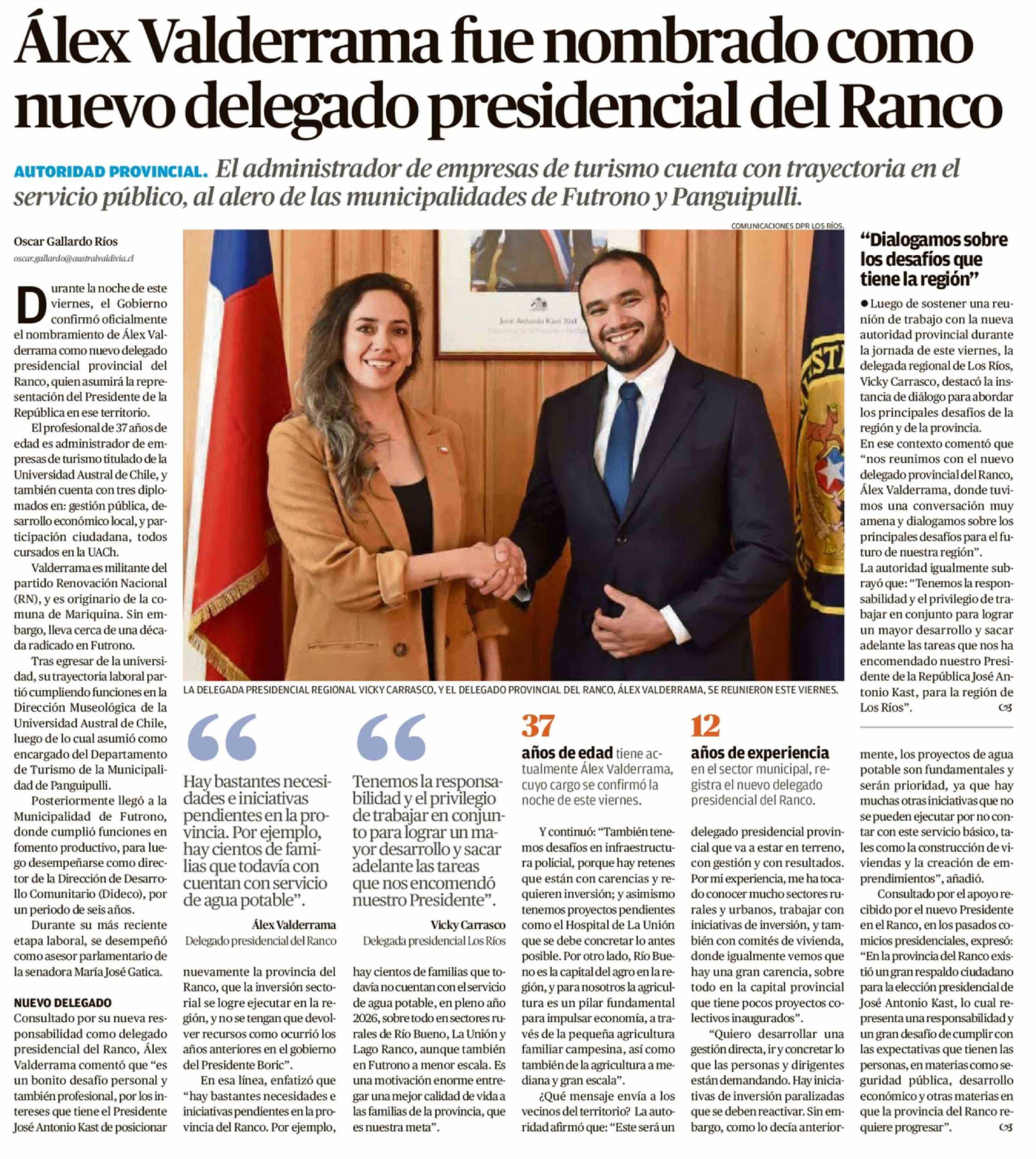 Título: Alex Valderrama fue nombrado como nuevo delegado presidencial del Ranco