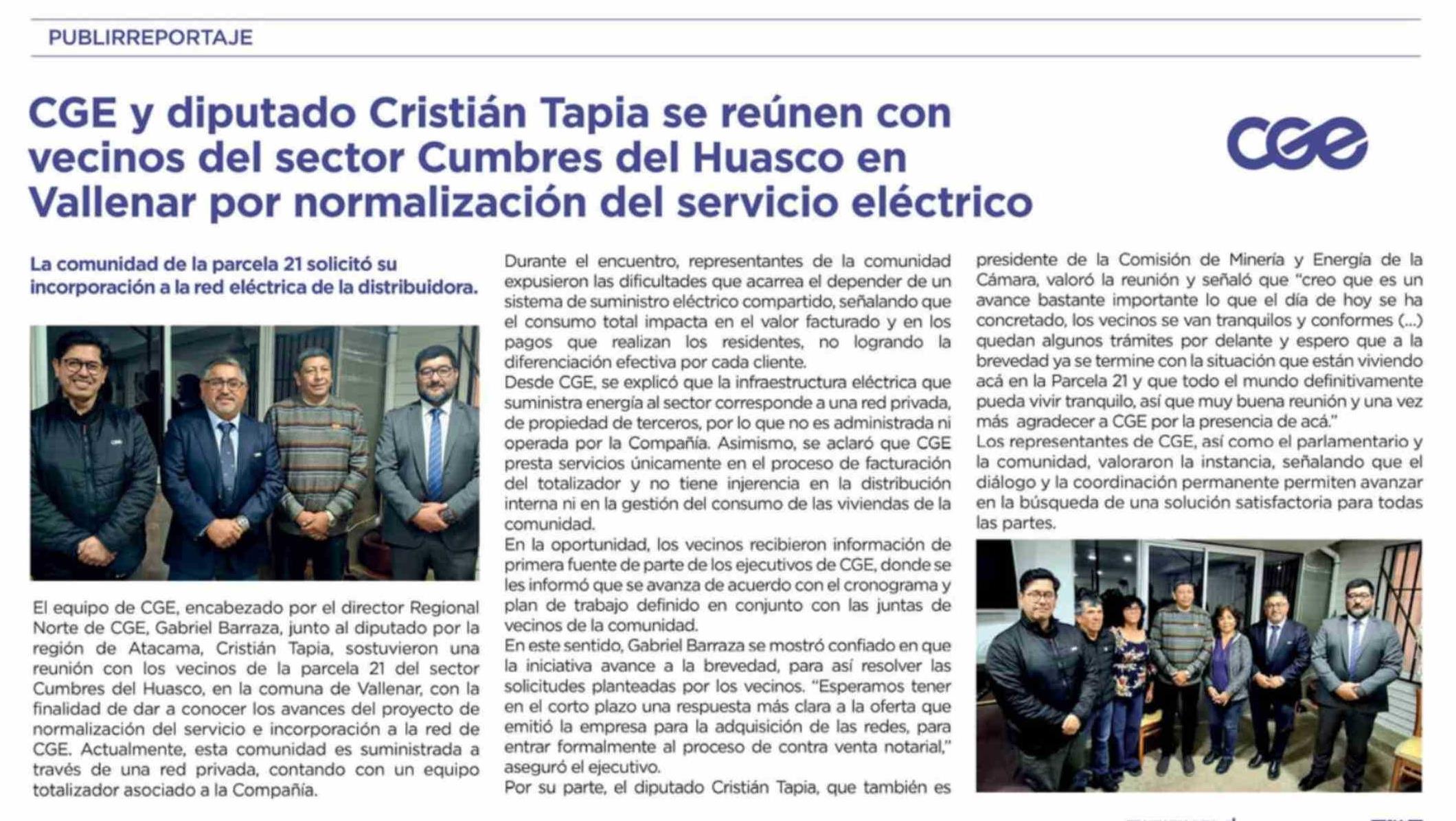 | Título: | CGE y diputado Cristián Tapia se reúnen con vecinos del sector Cumbres del Huasco en Vallenar por normalización del servicio eléctrico |