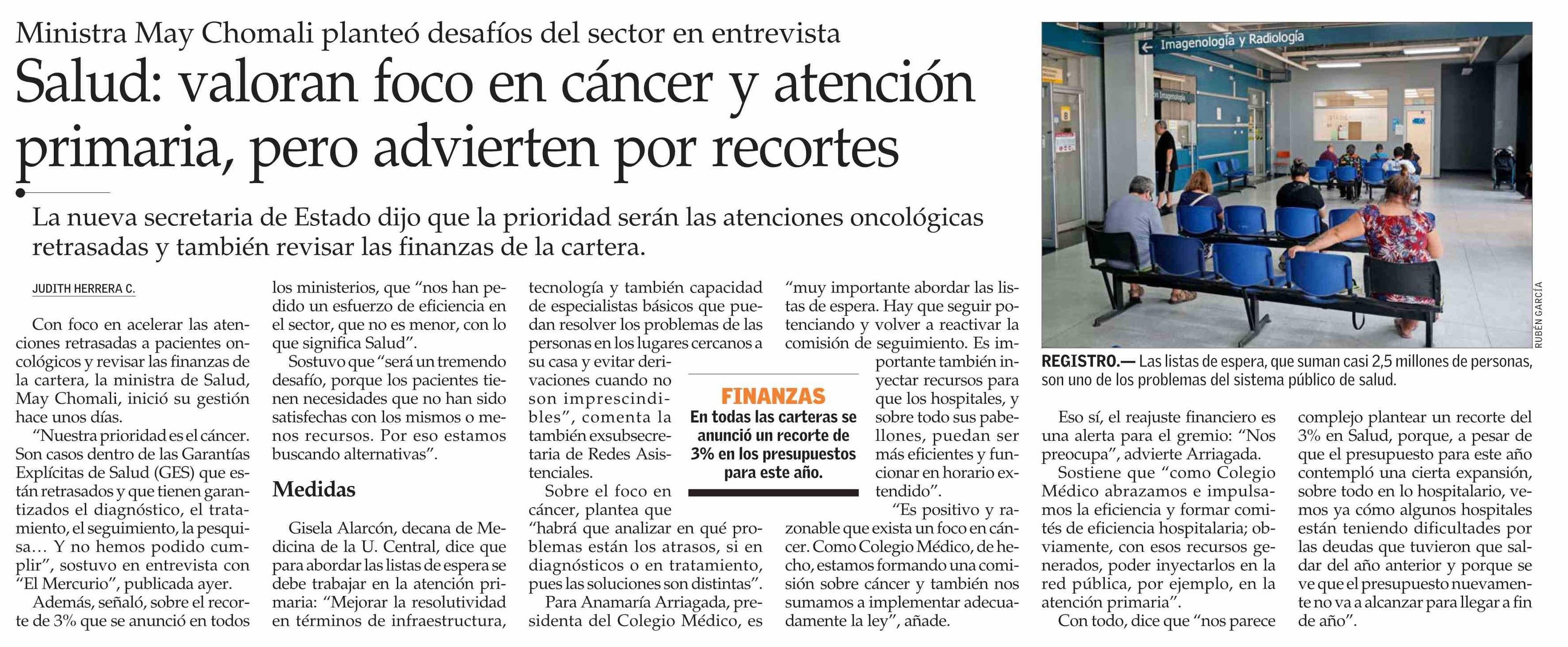 Salud: valoran foco en cáncer y atención primaria, pero advierten por recortes 15-03-2026 El Mercurio |
