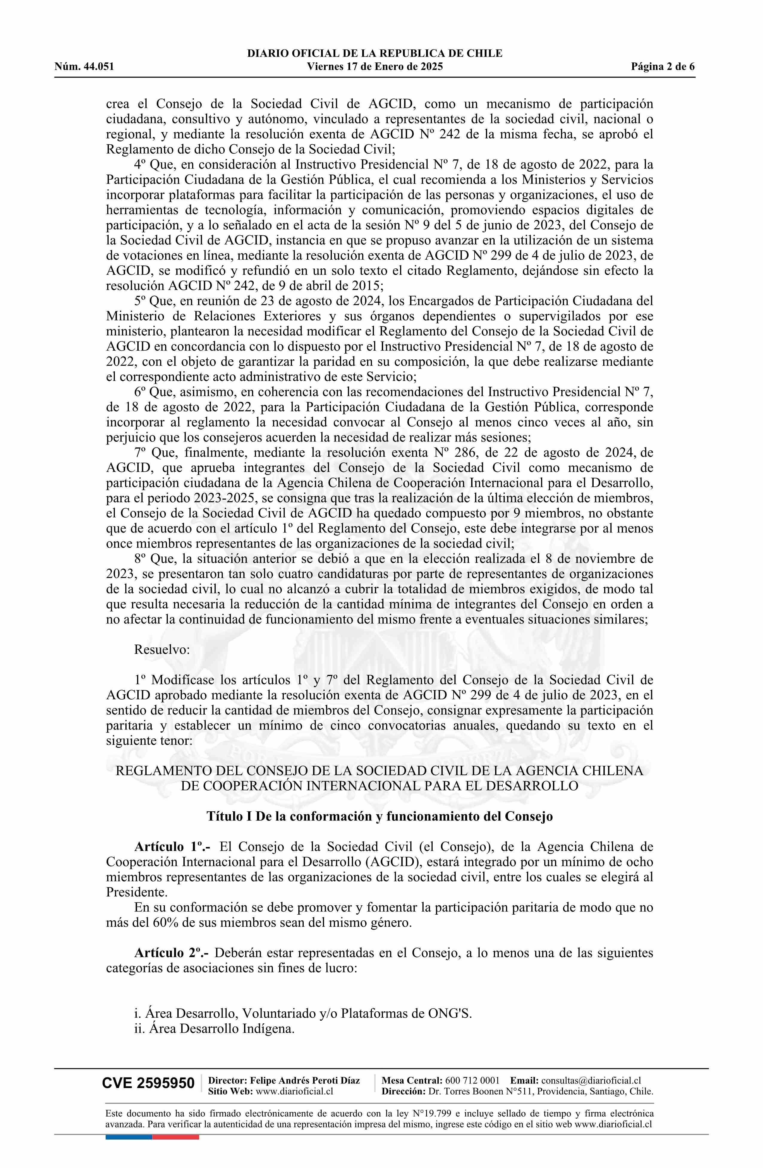 | Título: | Resolución exenta número 1, de 2025.- Modifica Reglamento del Consejo de la Sociedad Civil de la Agencia Chilena de Cooperación Internacional para el Desarrollo |