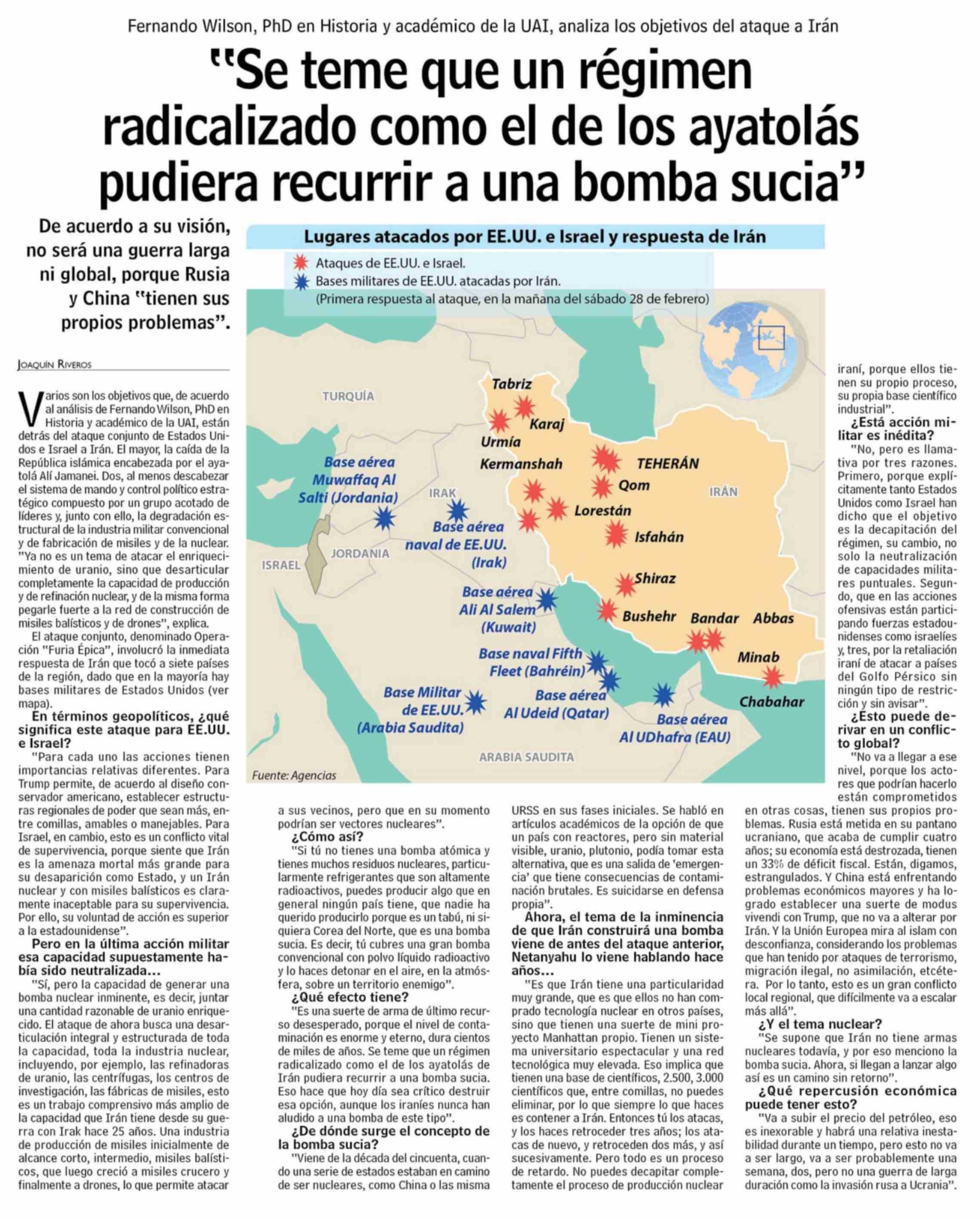 "Se teme que un régimen radicalizado como el de los ayatolás pudiera recurrir a una bomba sucia" 01-03-2026 Las Últimas Noticias |
