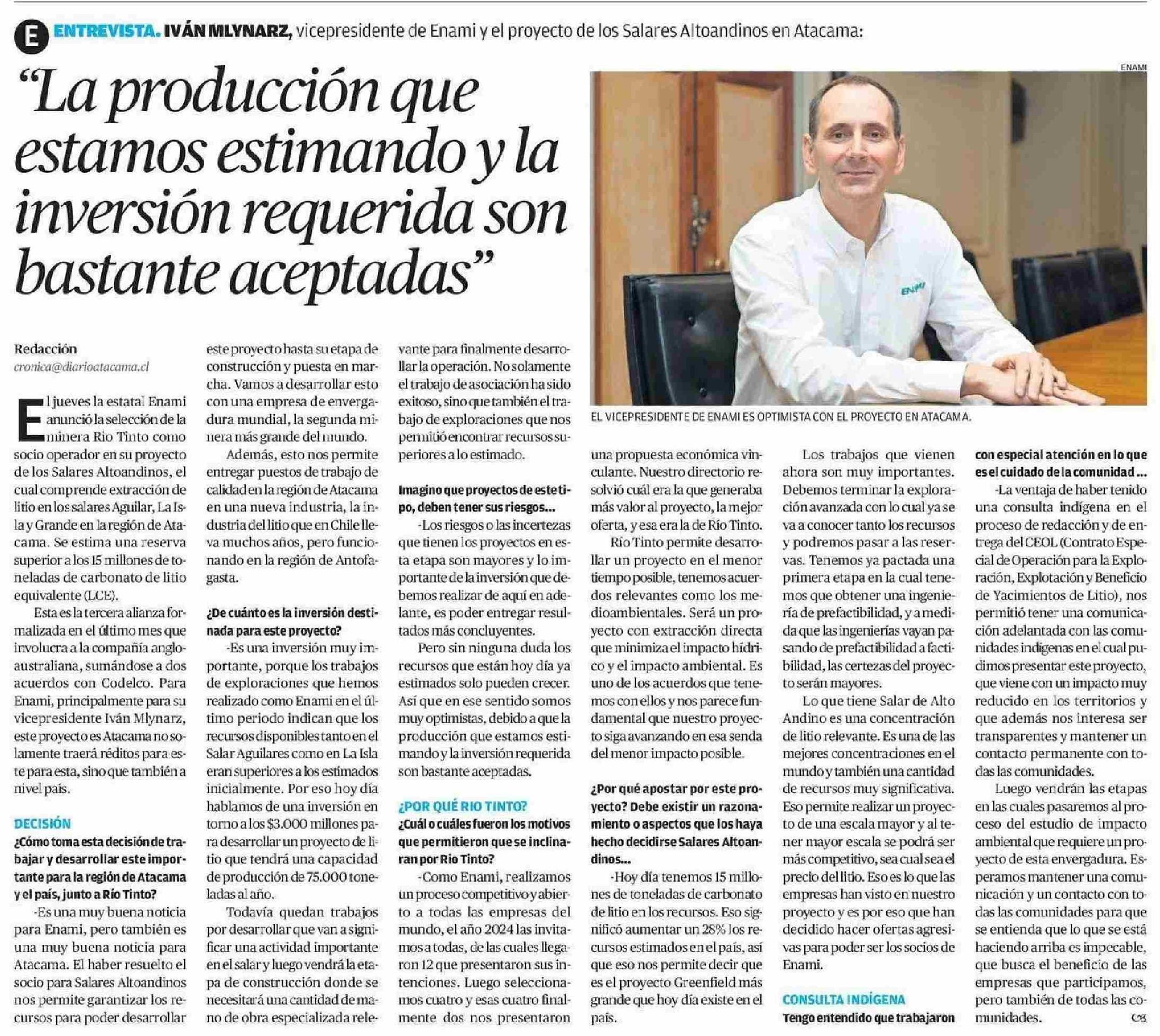 “La producción que estamos estimando y la inversión requerida son bastante aceptadas” 24-05-2025 El Diario de Atacama |