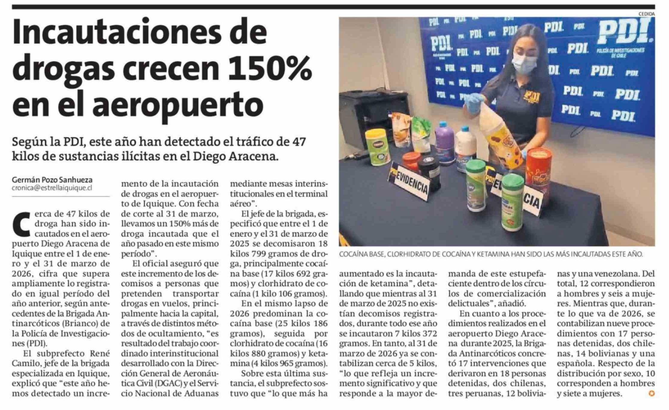 Incautaciones de drogas crecen 150% en el aeropuerto 14-04-2026 La Estrella de Iquique |