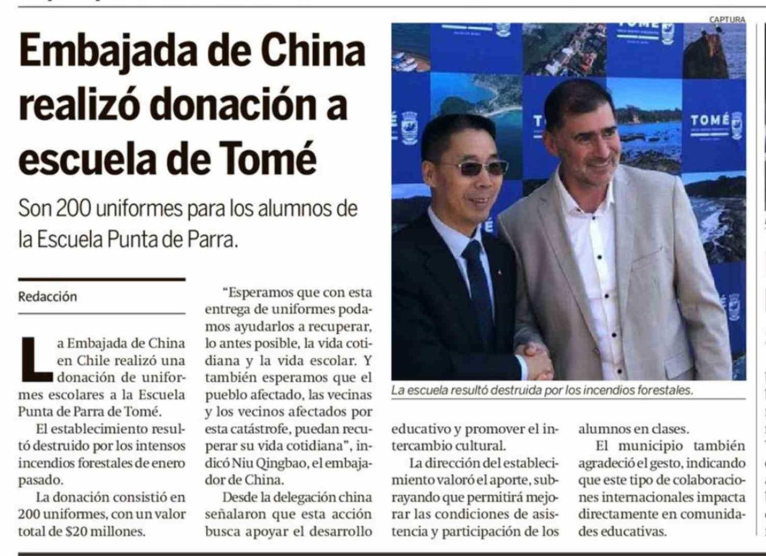 Embajada de China realizó donación a escuela de Tomé