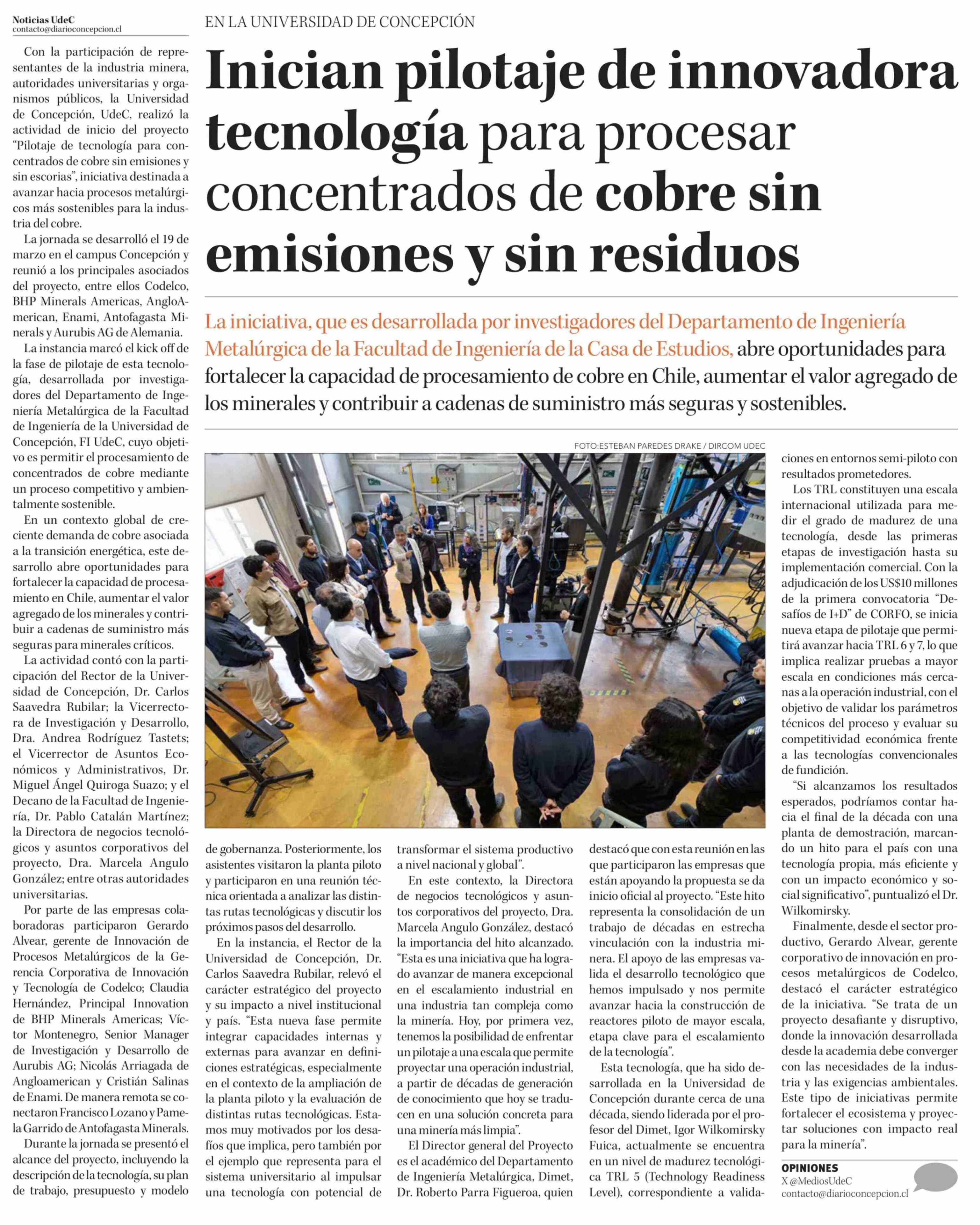 Título: Inician pilotaje de innovadora tecnología para procesar concentrados de cobre sin emisiones y sin residuos