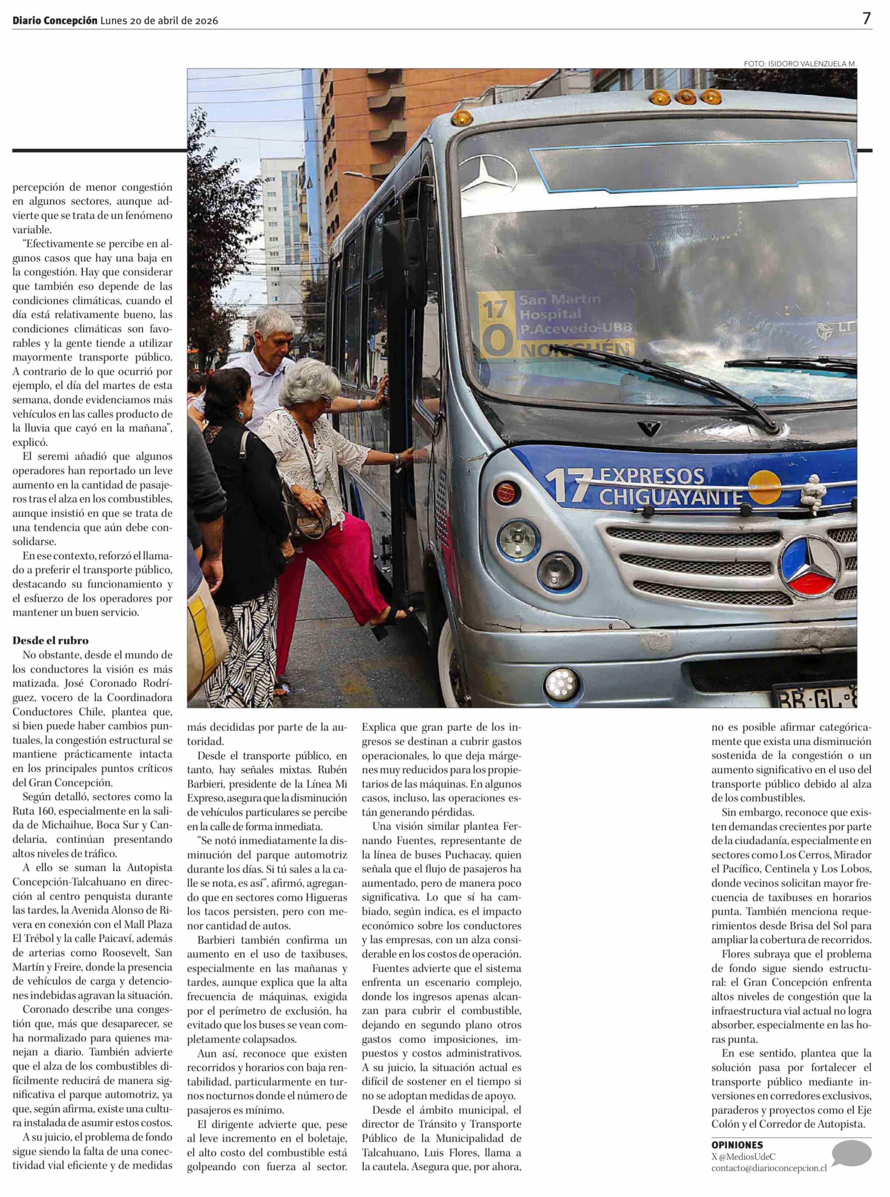 Menos autos, más micros llenas: la percepción en el Gran Concepción tras el alza de los combustibles 20-04-2026 Diario Concepción |