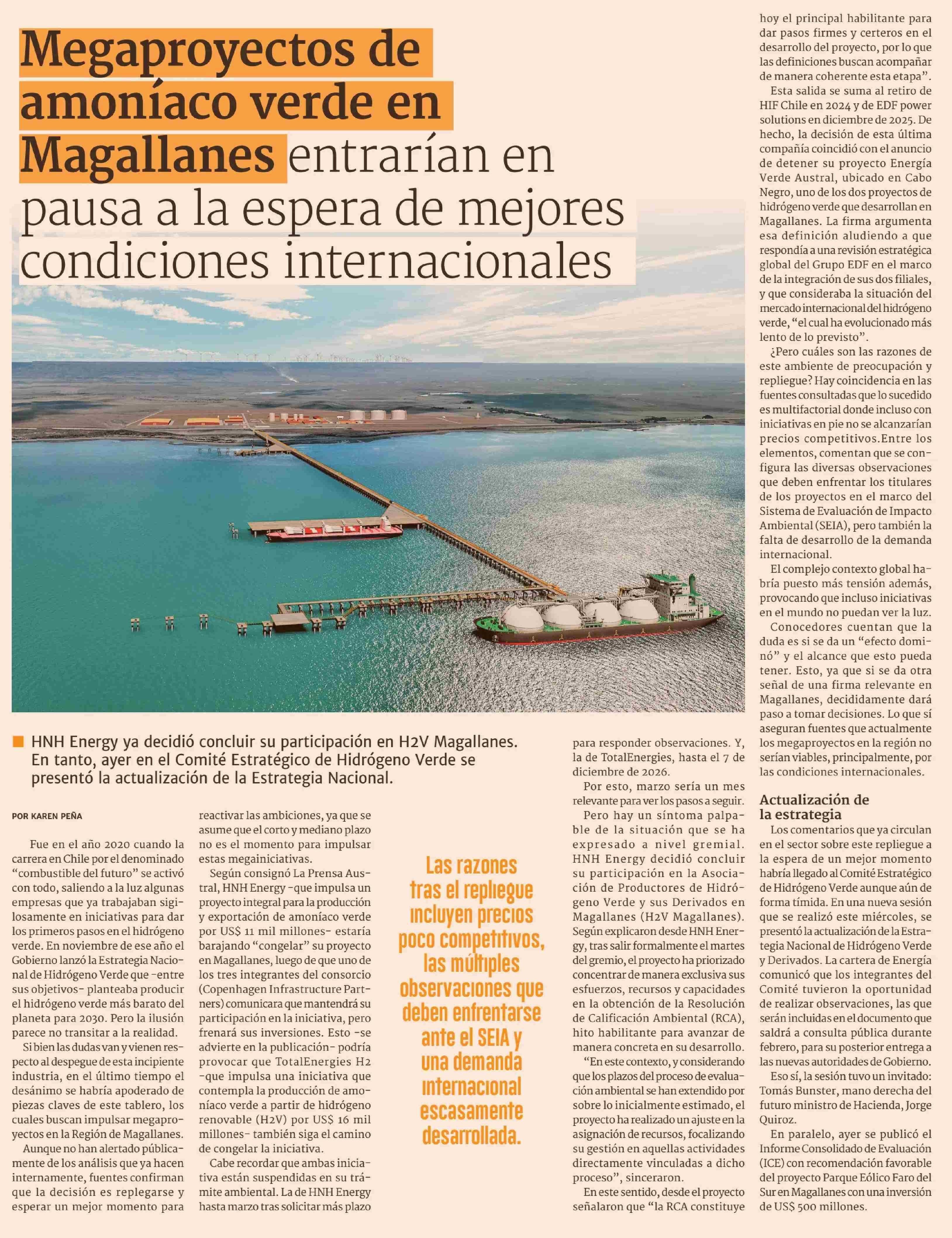 Megaproyectos de amoníaco verde en Magallanes entrarían en pausa a la espera de mejores condiciones internacionales 22-01-2026 Diario Financiero |