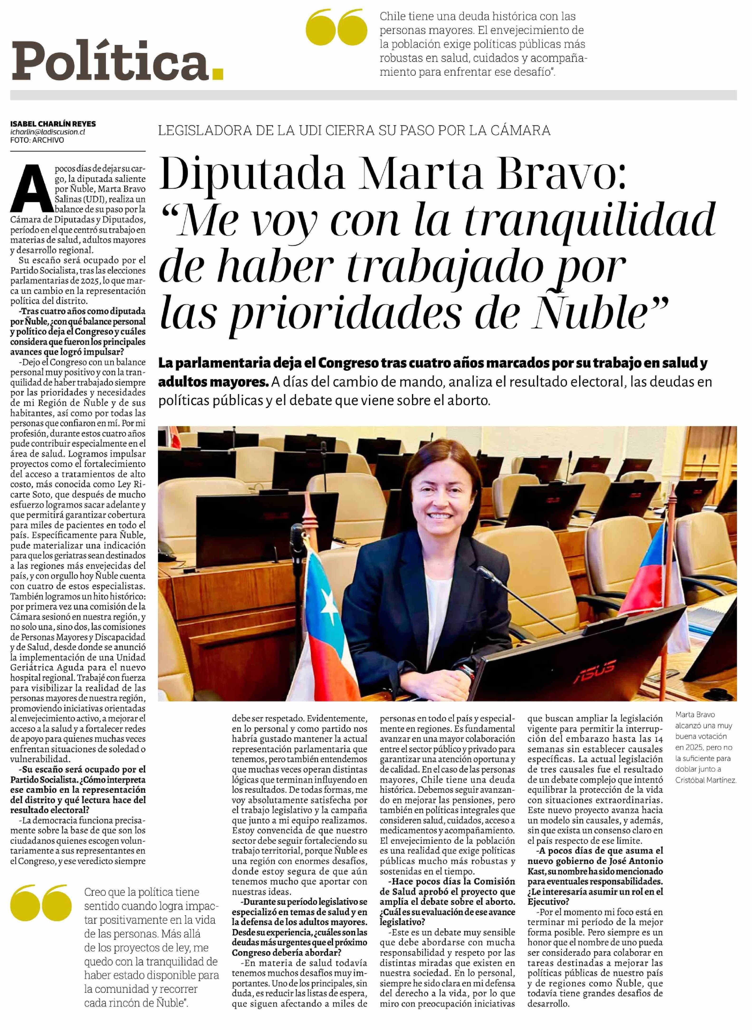 Título: Diputada Marta Bravo: "Me voy con la tranquilidad de haber trabajado por las prioridades de Nuble"